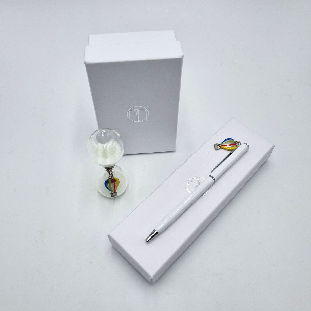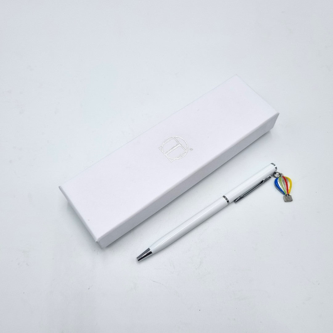 - penna a sfera bianca con ciondolo mongolfiera, smaltato ricoperto d'argento;