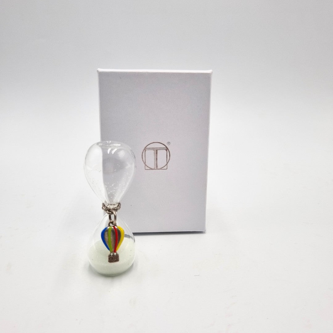 - clessidra in vetro con sabbia bianca e ciondolo mongolfiera, smaltato ricoperto d'argento (7 cm);