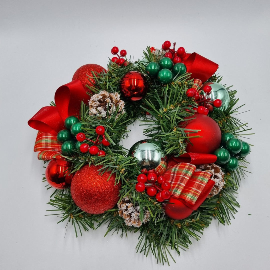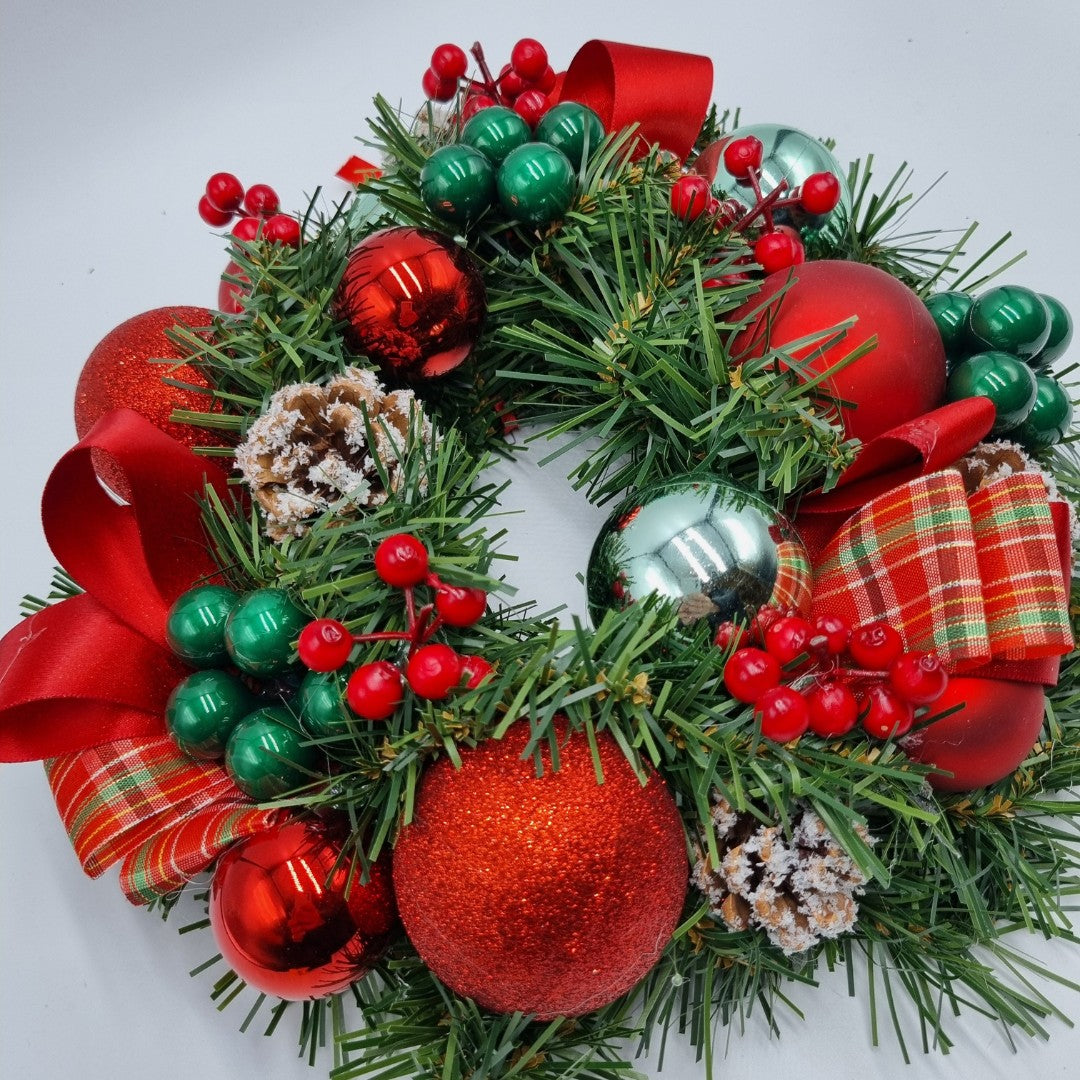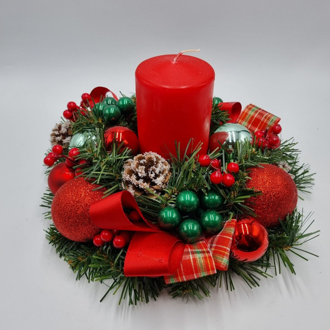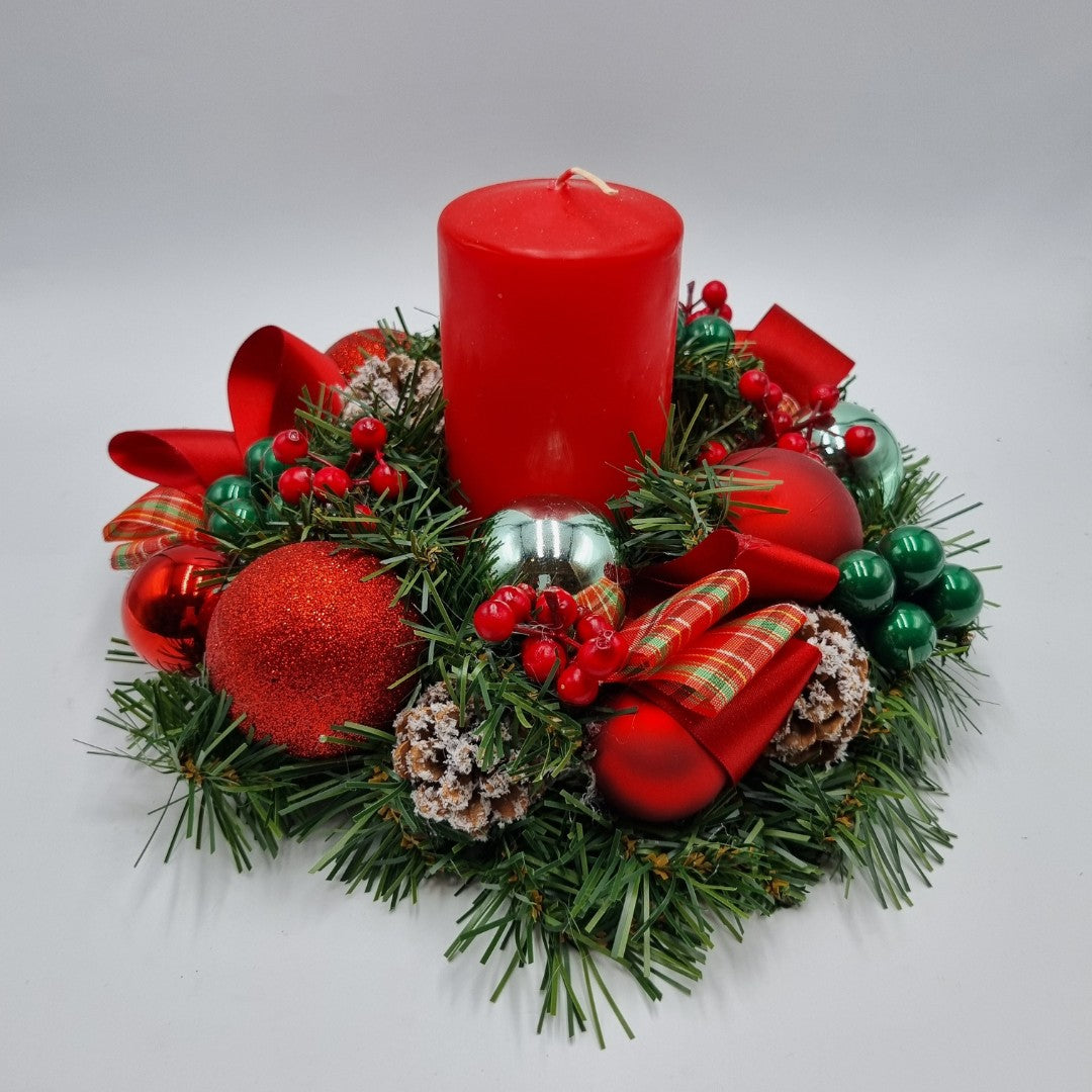 Ghirlanda di Natale artigianale, con candela rossa, può essere usato anche come centrotavola (diametro 28 cm).