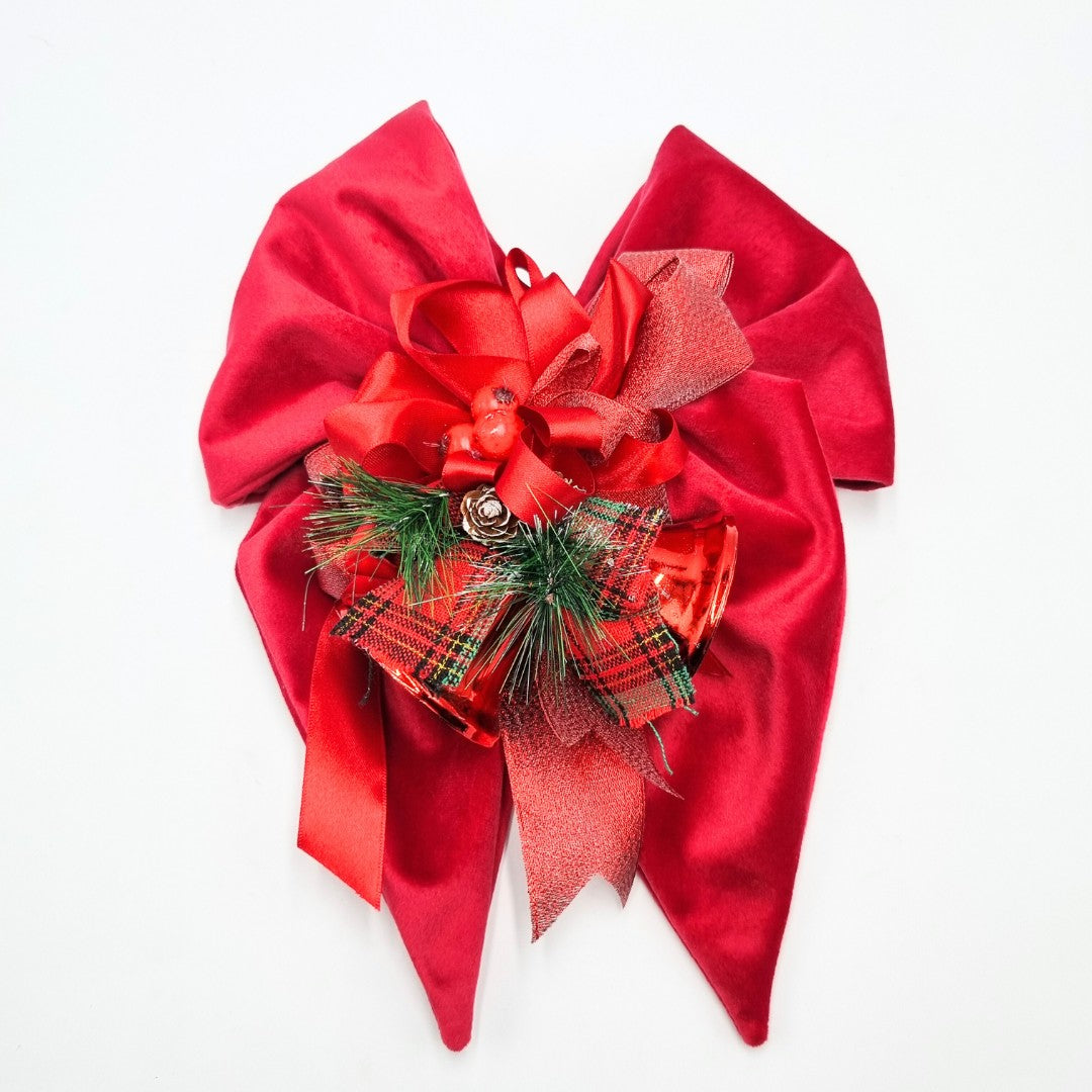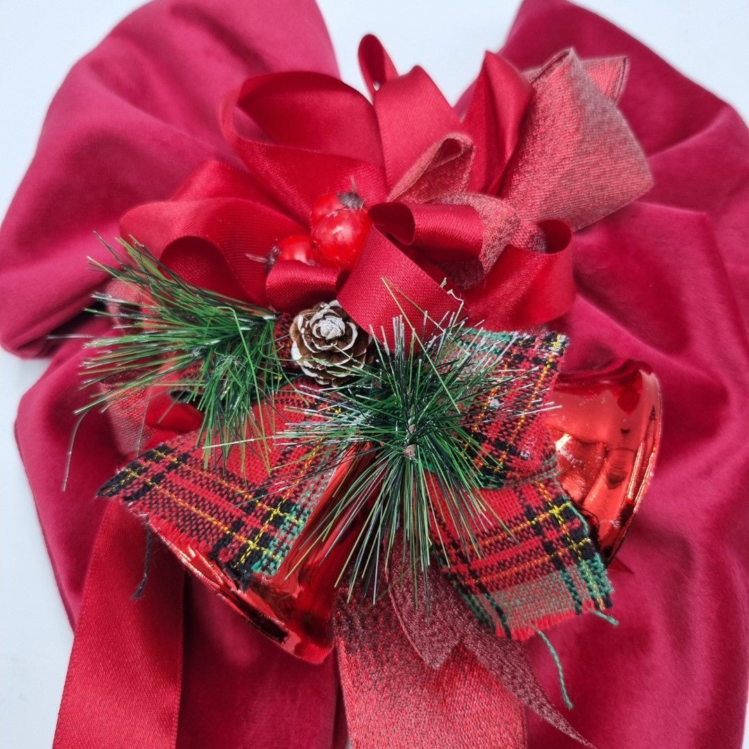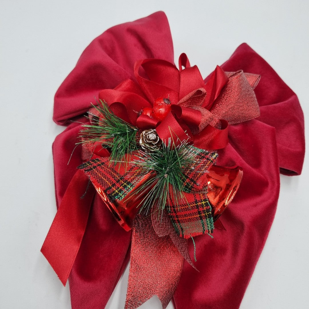 Fiocco in velluto rosso, natalizio, artigianale, con decorazione campane.