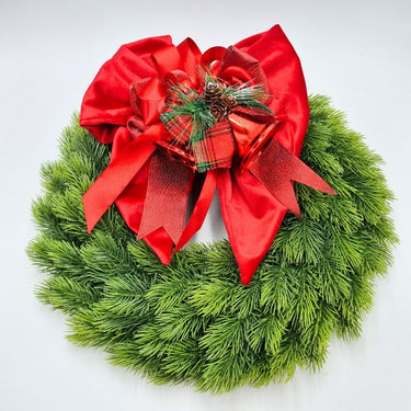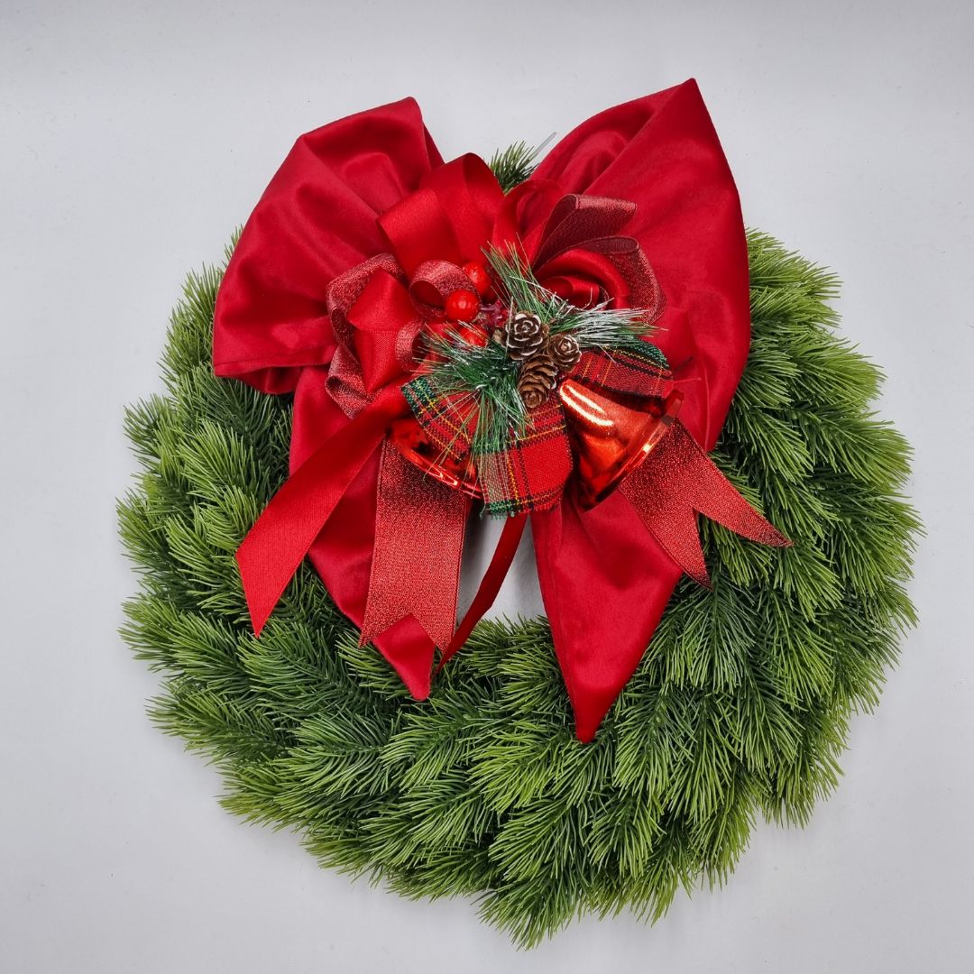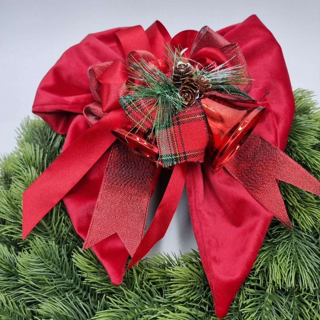 Ghirlanda artificiale verde, soft touch, con fiocco in velluto, artigianale, con decorazione campane.