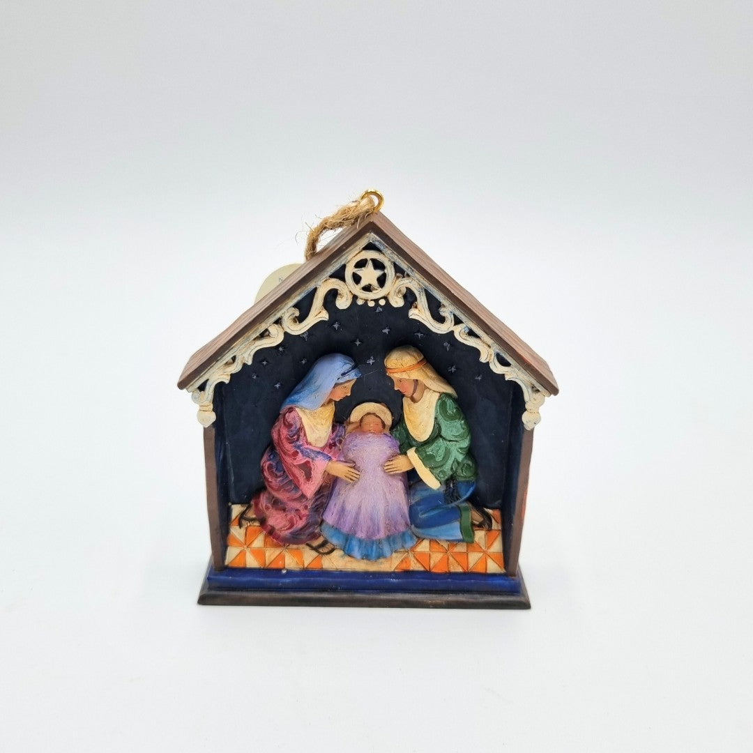 Sacra Faniglia Jim Shore da appendere o da appoggiare, in resina dipinta a mano effetto legno.