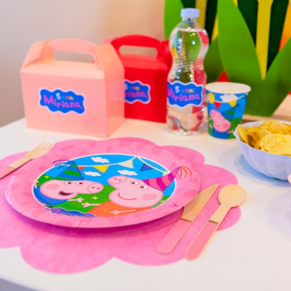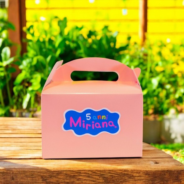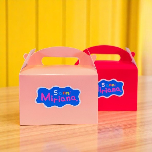 Confezione da 6 pezzi di lunch box, assortite nei colori rosso e rosa, con adesivo personalizzato con nome e anni del festeggiato.