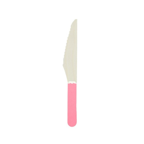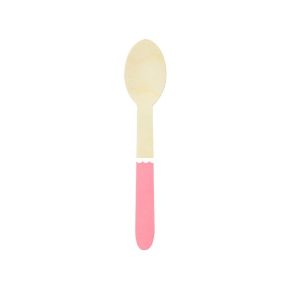 Confezione di posate in legno da 24 pezzi (8 coltelli, 8 cucchiai, 8 forchette) con manico rosa e particolare dorato.