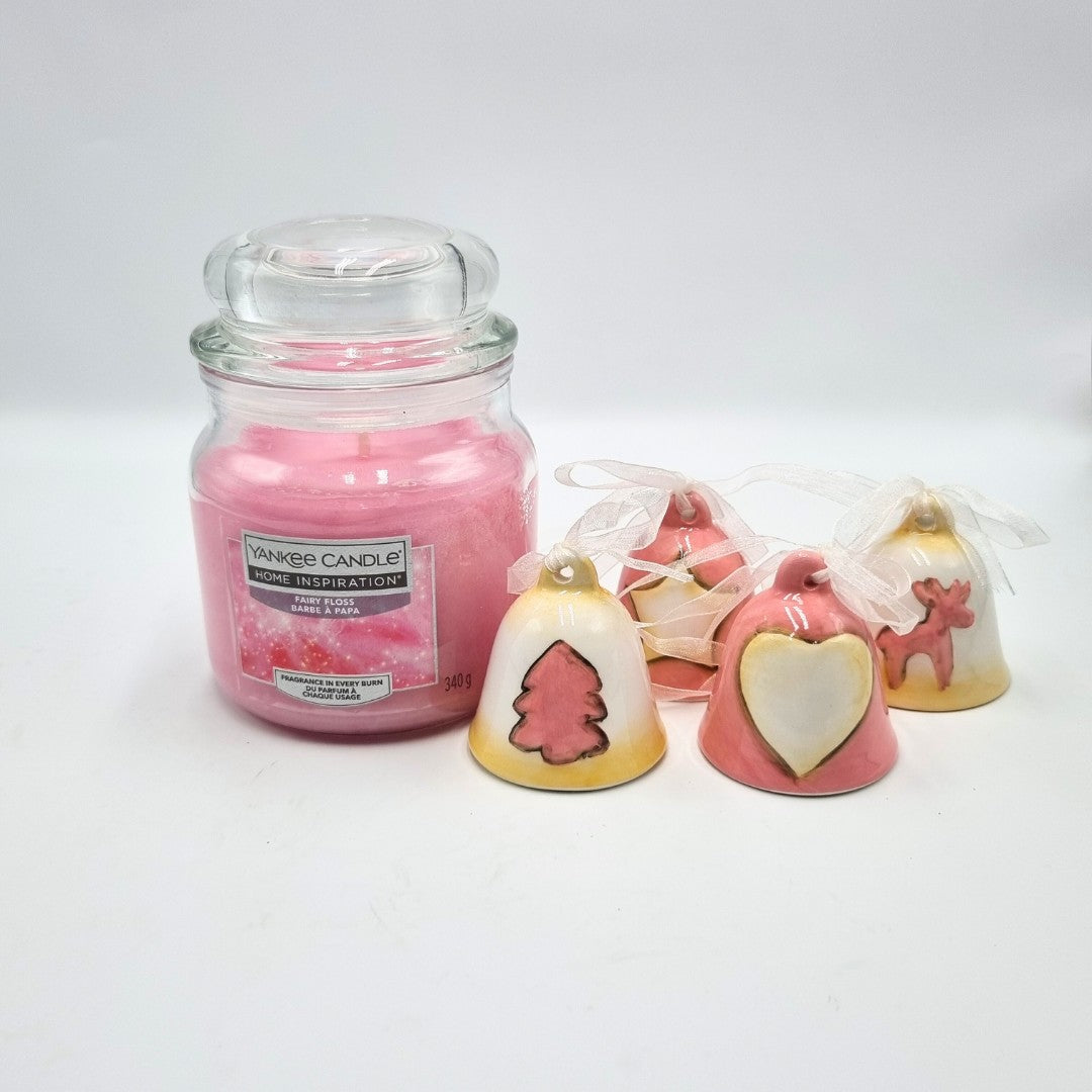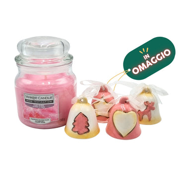 Giara media Yankee Candle "Fairy Floss" (340g), con n. 4 campanelle natalizie IN OMAGGIO (h 5,5 cm).