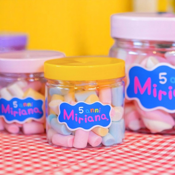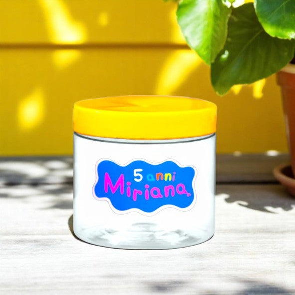 Set da n.8 barattolini in PET da 250ml, con tappi rosa e giallo assortiti e personalizzato con nome adesivo.