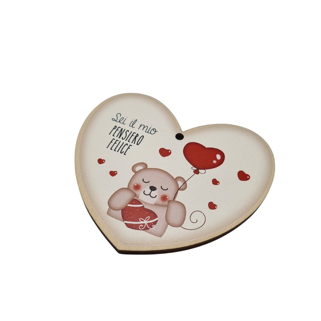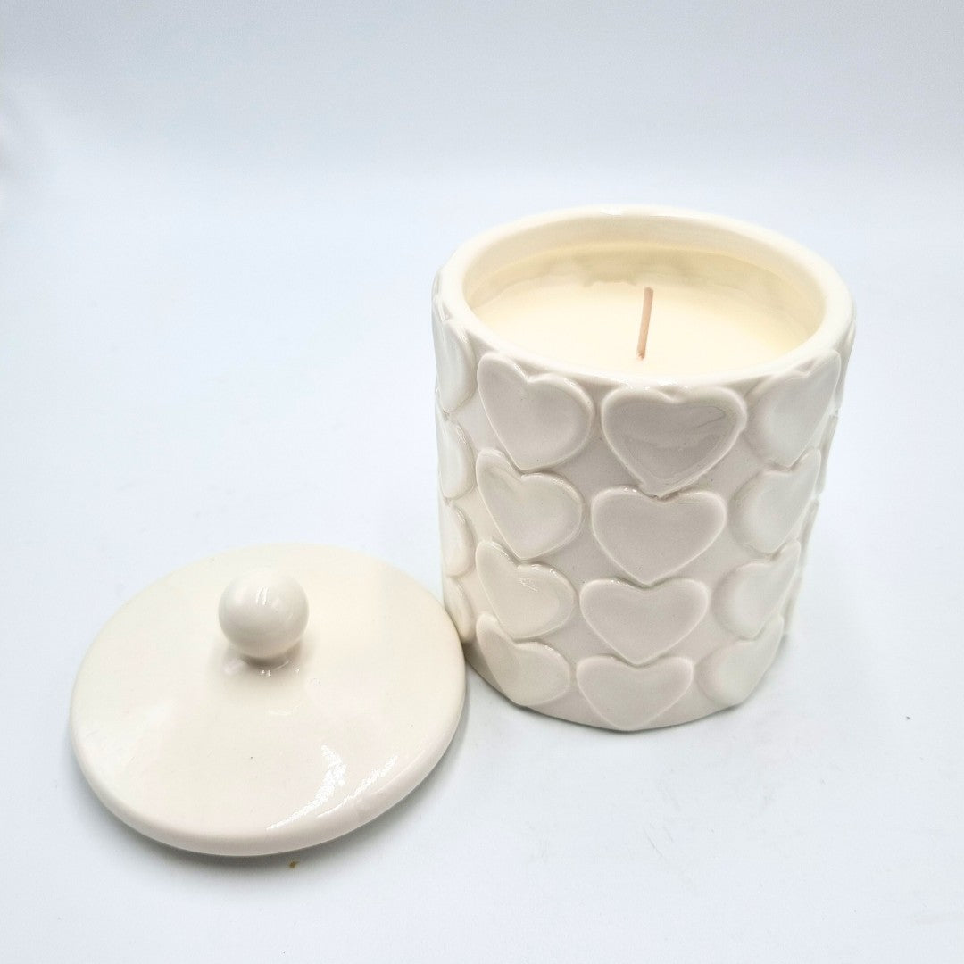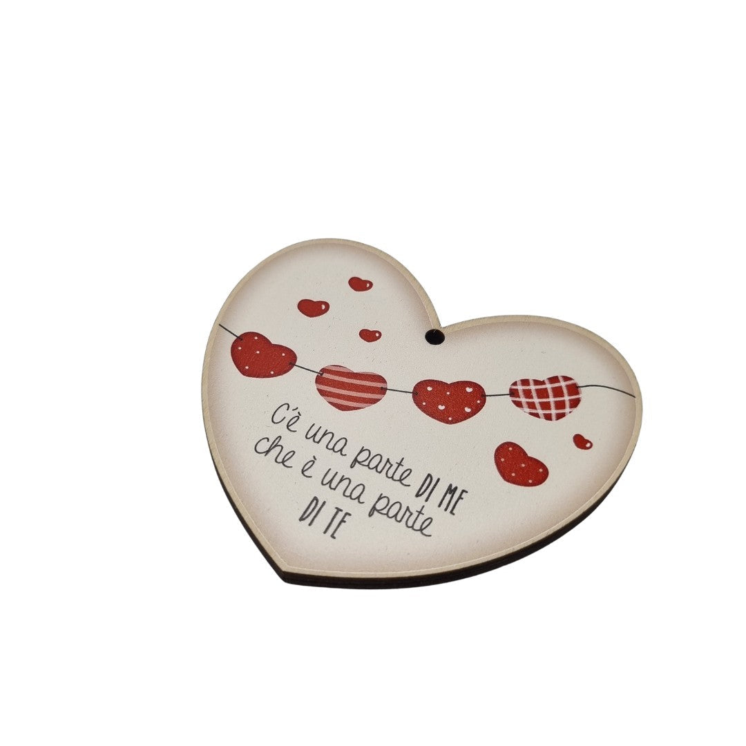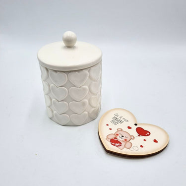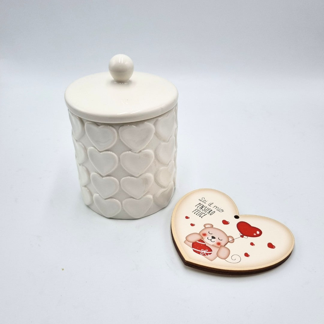 Barattolo in ceramica con candela profumata ( h 12 cm) e cuore magnete in legno con frase ( 10 x 7 cm).