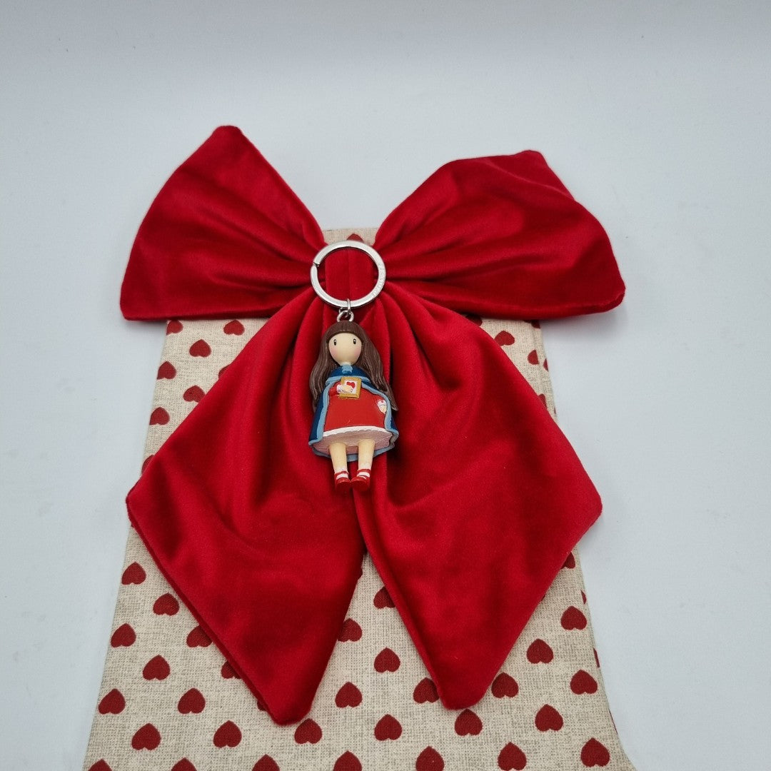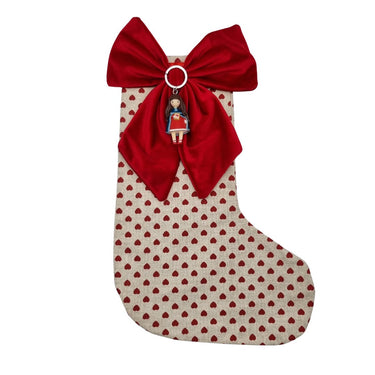 Calza in cotone con stampa cuori rossi, fiocco rosso in velluto e portachiavi Gorjuss Santoro London (staccabile).