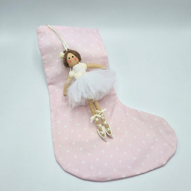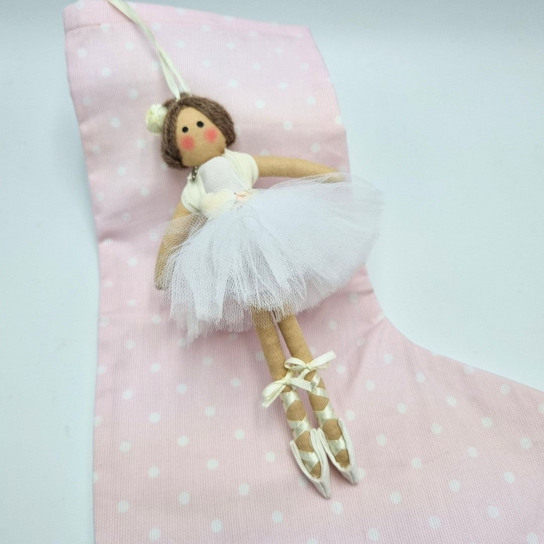 Calza della Befana, in cotone rosa a pois bianchi, con Bambolina ballerina bianca (20 cm) (staccabile).