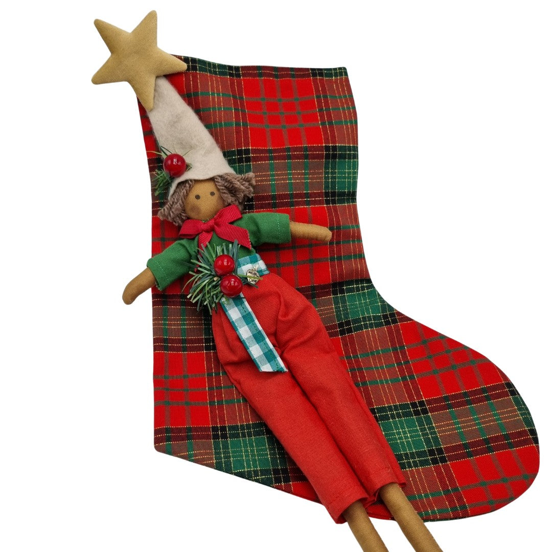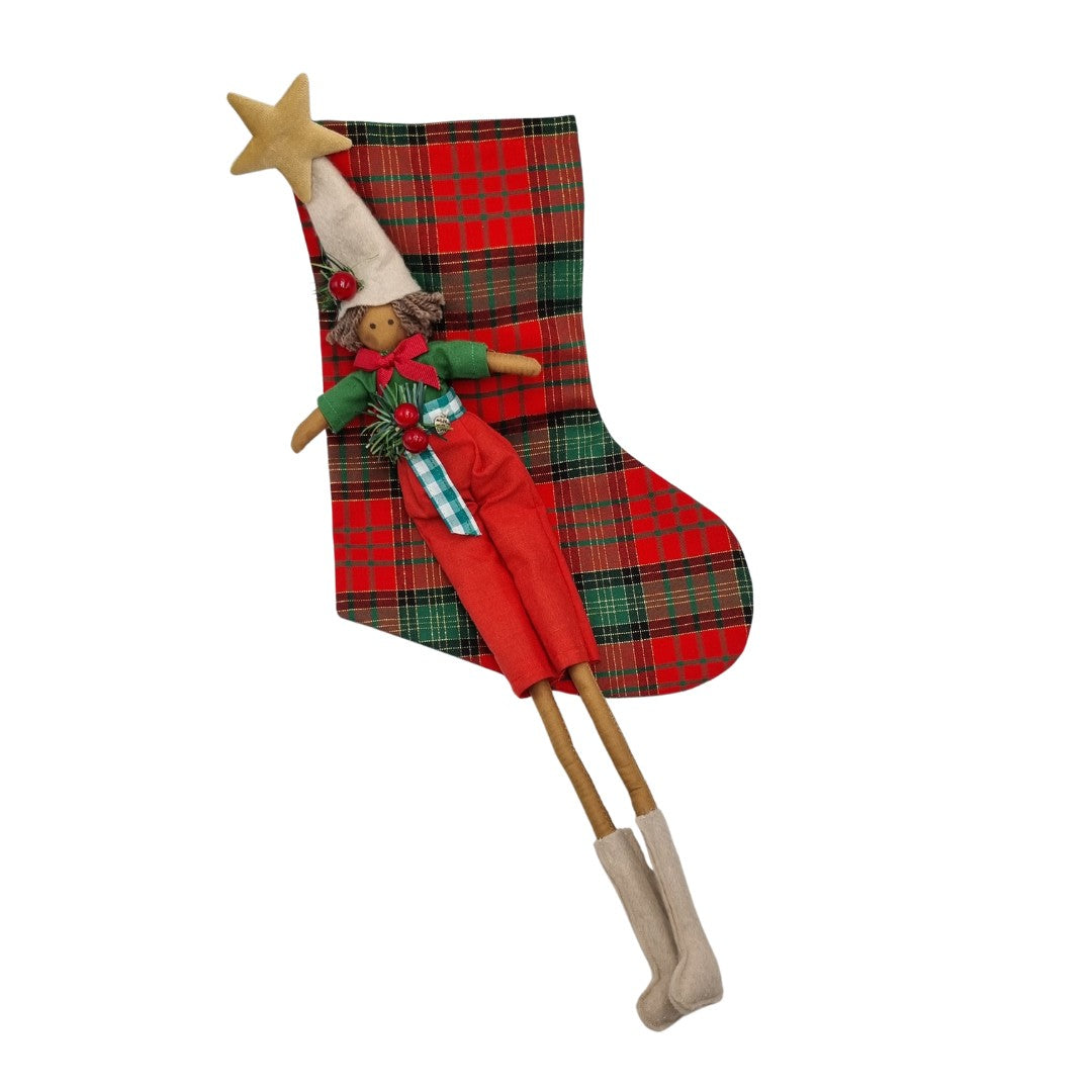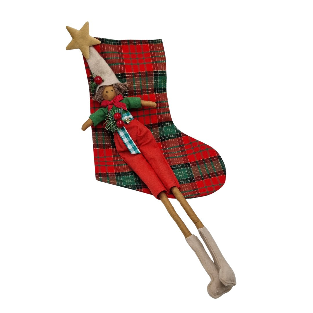 Calza della Befana in cotone, fantasia scozzese con "Elfo Gambe lunghe" (42 cm) (staccabile) e stellina in velluto.
