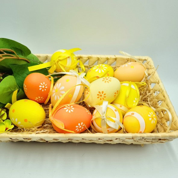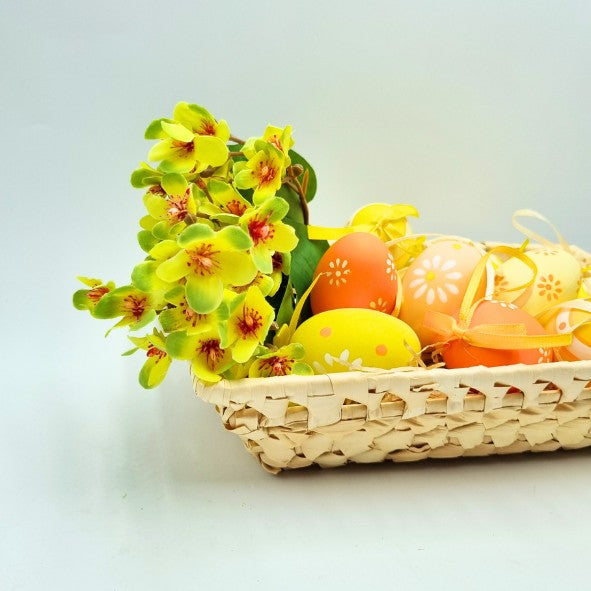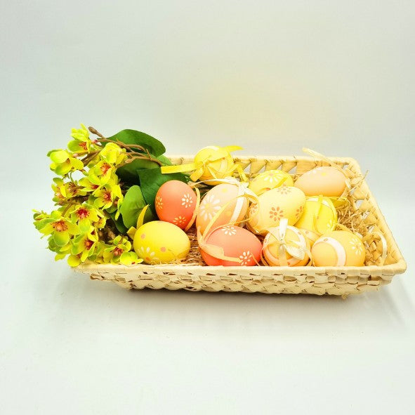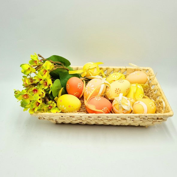 Cestino intrecciato (28 x 18 cm) con 12 uova in plastica decorate (6 cm) e un mazzetto di fiori in stoffa (36 cm).