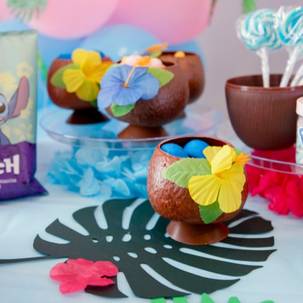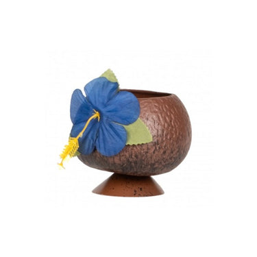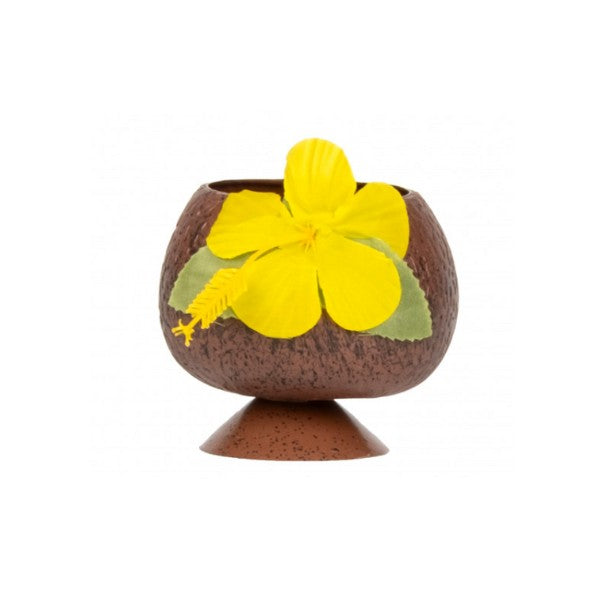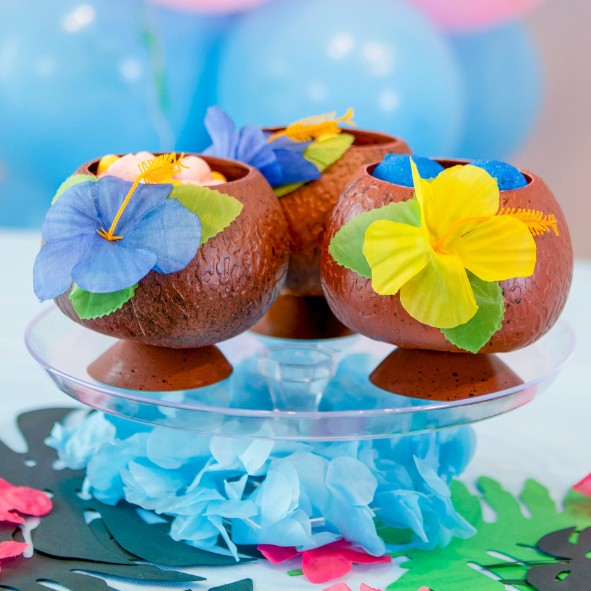 Coppa in plastica, hawaiana a forma di cocco, con fiore in stoffa blu o giallo, da usare come contenitore per caramelle o patatine.