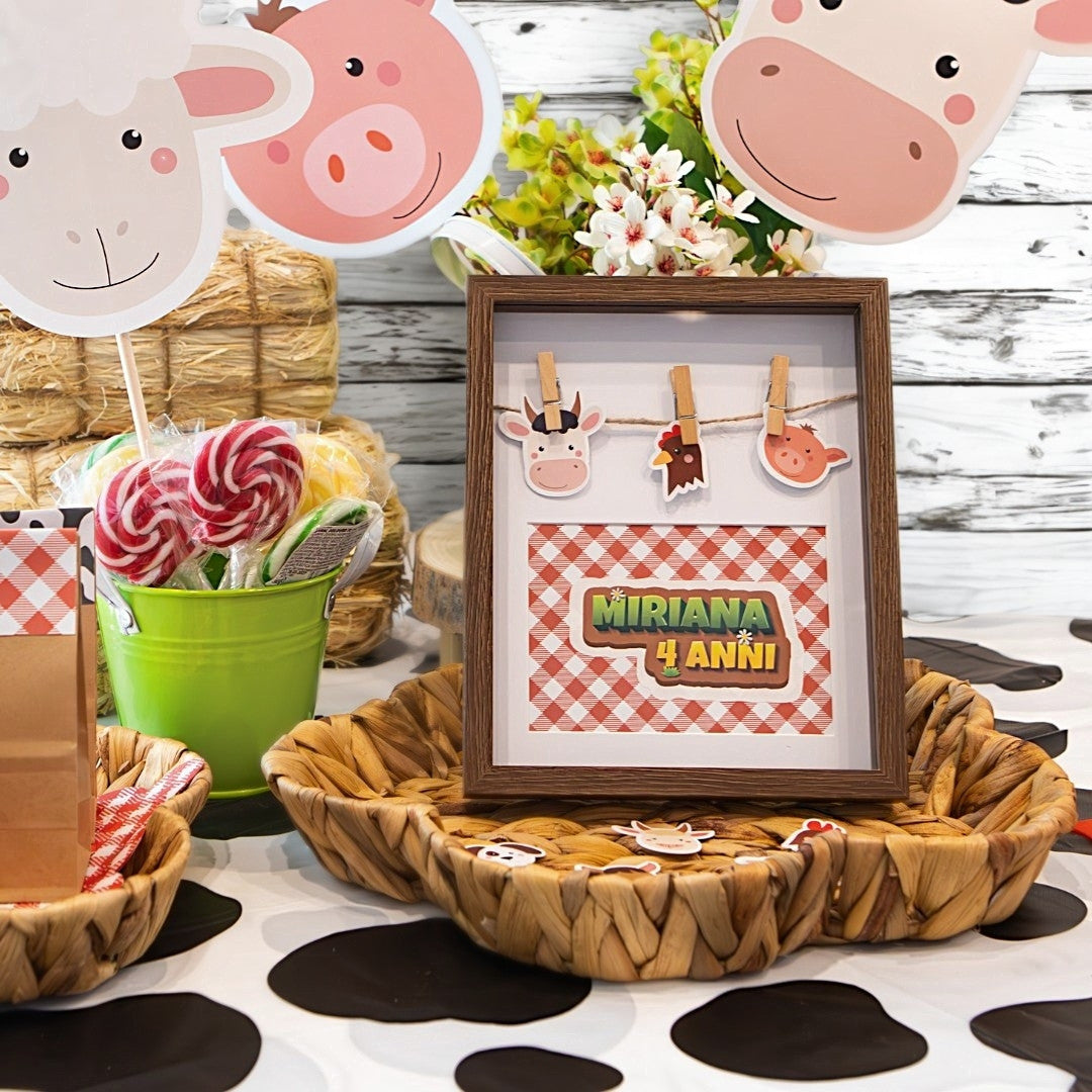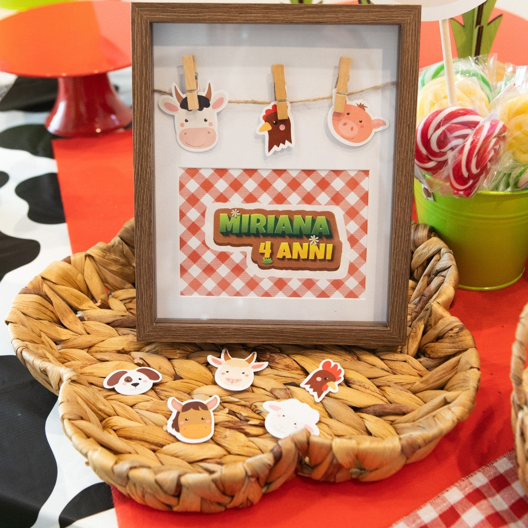 Cornice in legno, personalizzata con nome del festeggiato a tema fattoria.