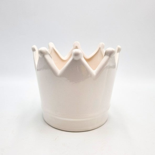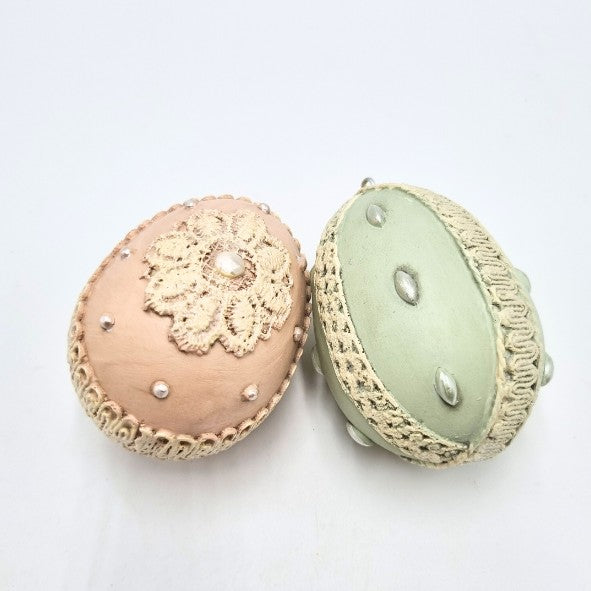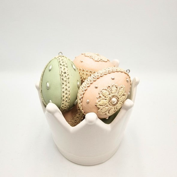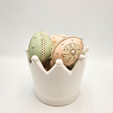 Corona in ceramica bianca (diametro 23 cm e h 13 cm) con 5 uova in resina, assortite verdi e rosa chiare, decorate con perle e merletti (7 cm).