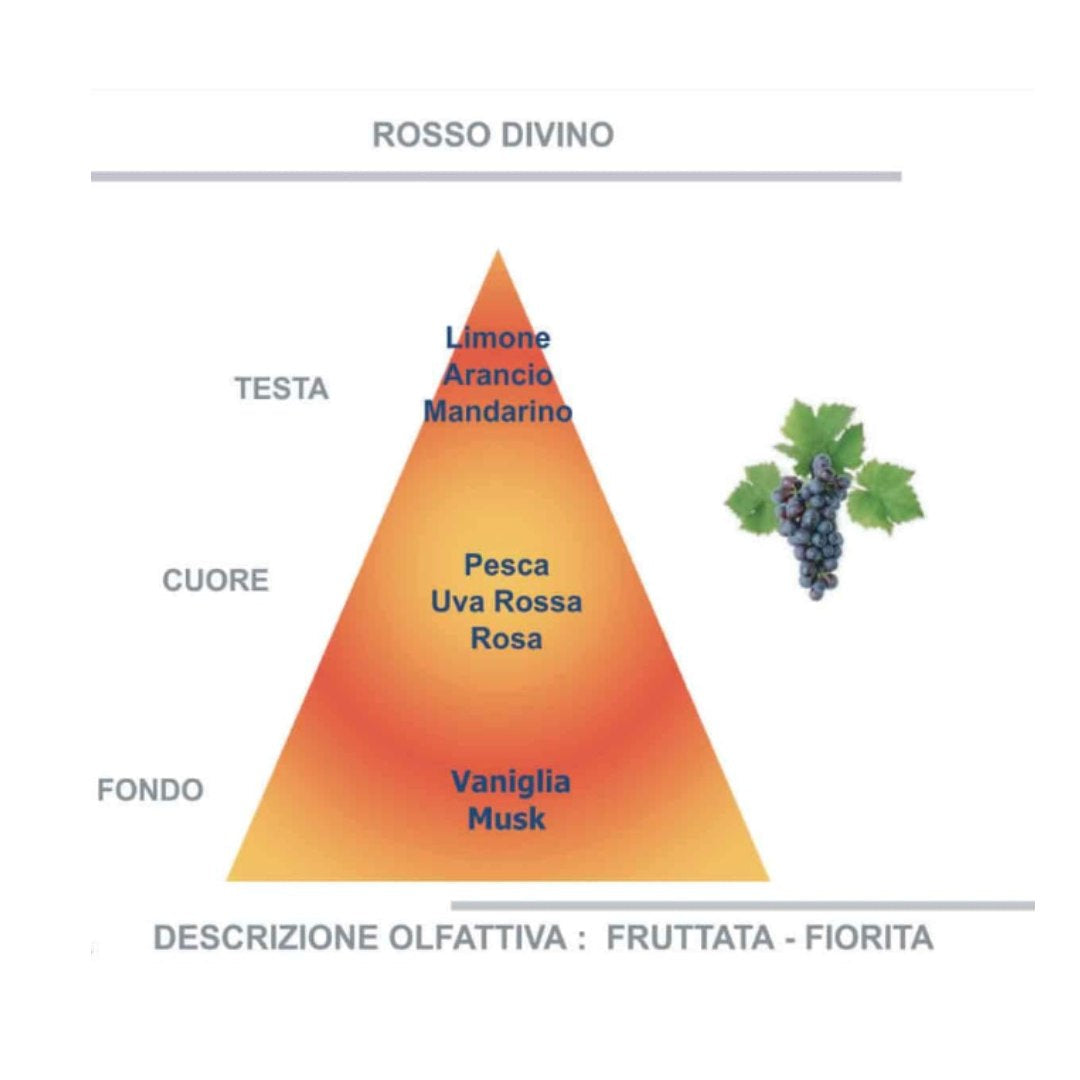 Rosso Divino: una fragranza dal carattere piacevolmente fruttato e vanigliato. La freschezza degli agrumi si fonde con le morbide note di pesca, uva rossa e rosa. Si completa nel ricco fondo di vaniglia e musk.