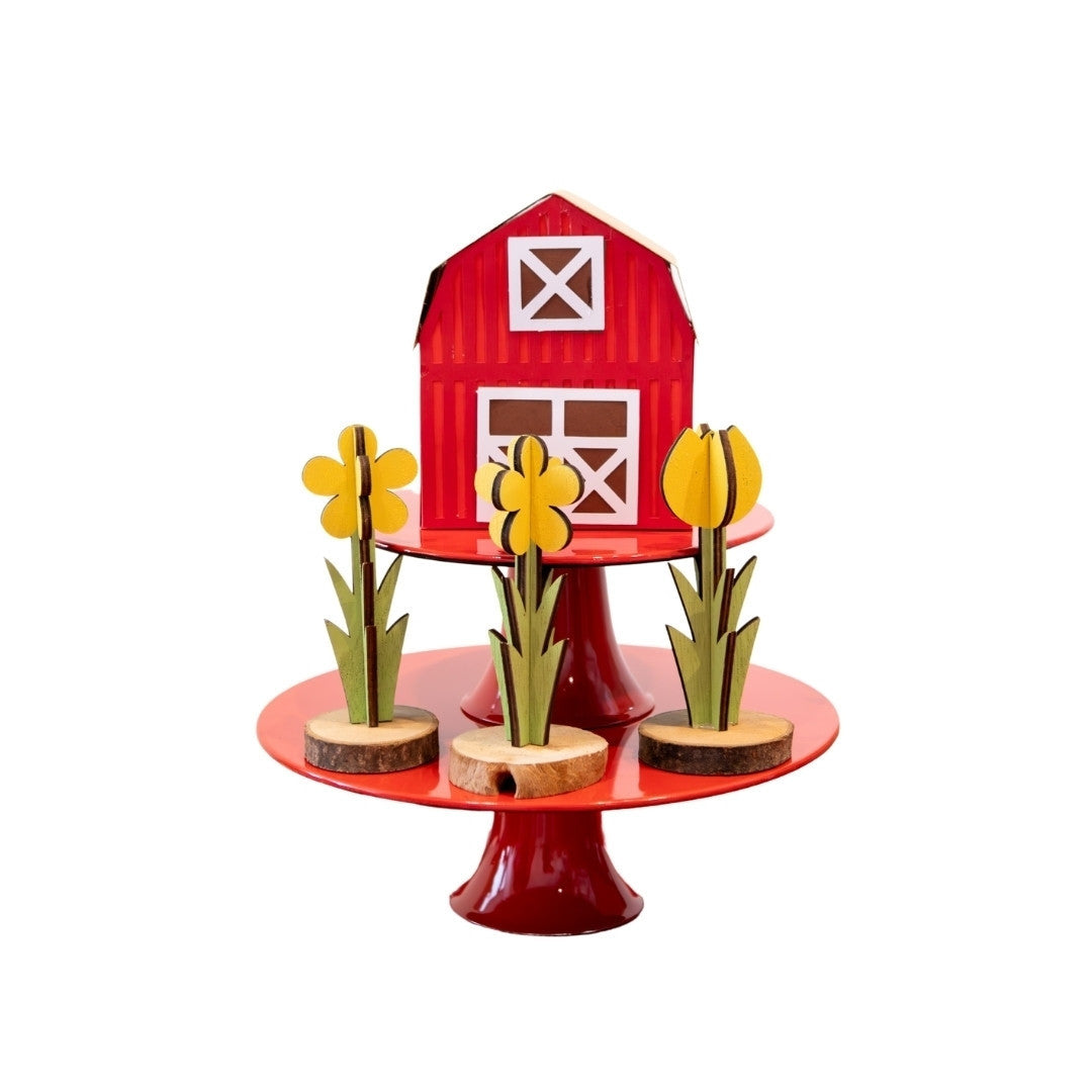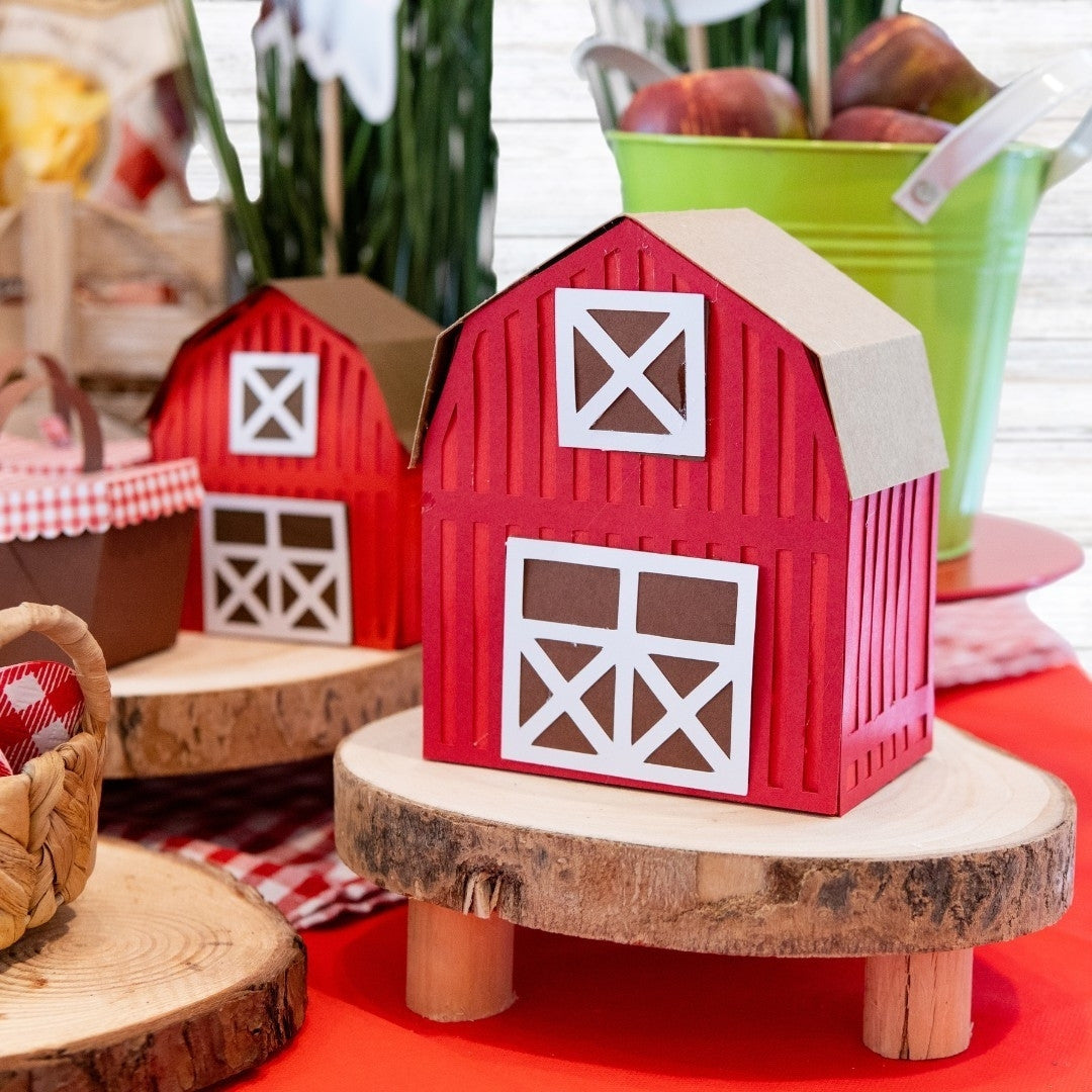 Fienile in cartoncino interamente realizzato a mano, per decorare il tavolo festa a tema fattoria o da usare come cake topper.
