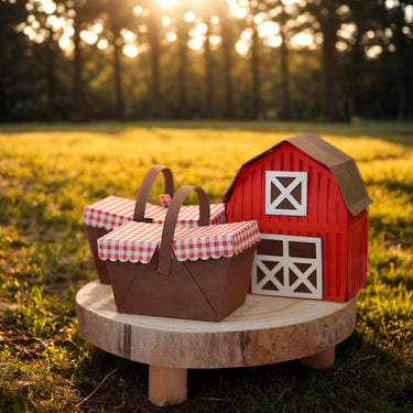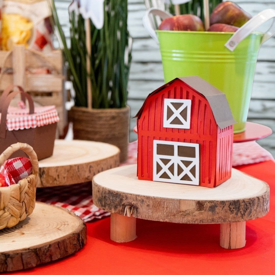 Fienile in cartoncino interamente realizzato a mano, per decorare il tavolo festa a tema fattoria o da usare come cake topper.