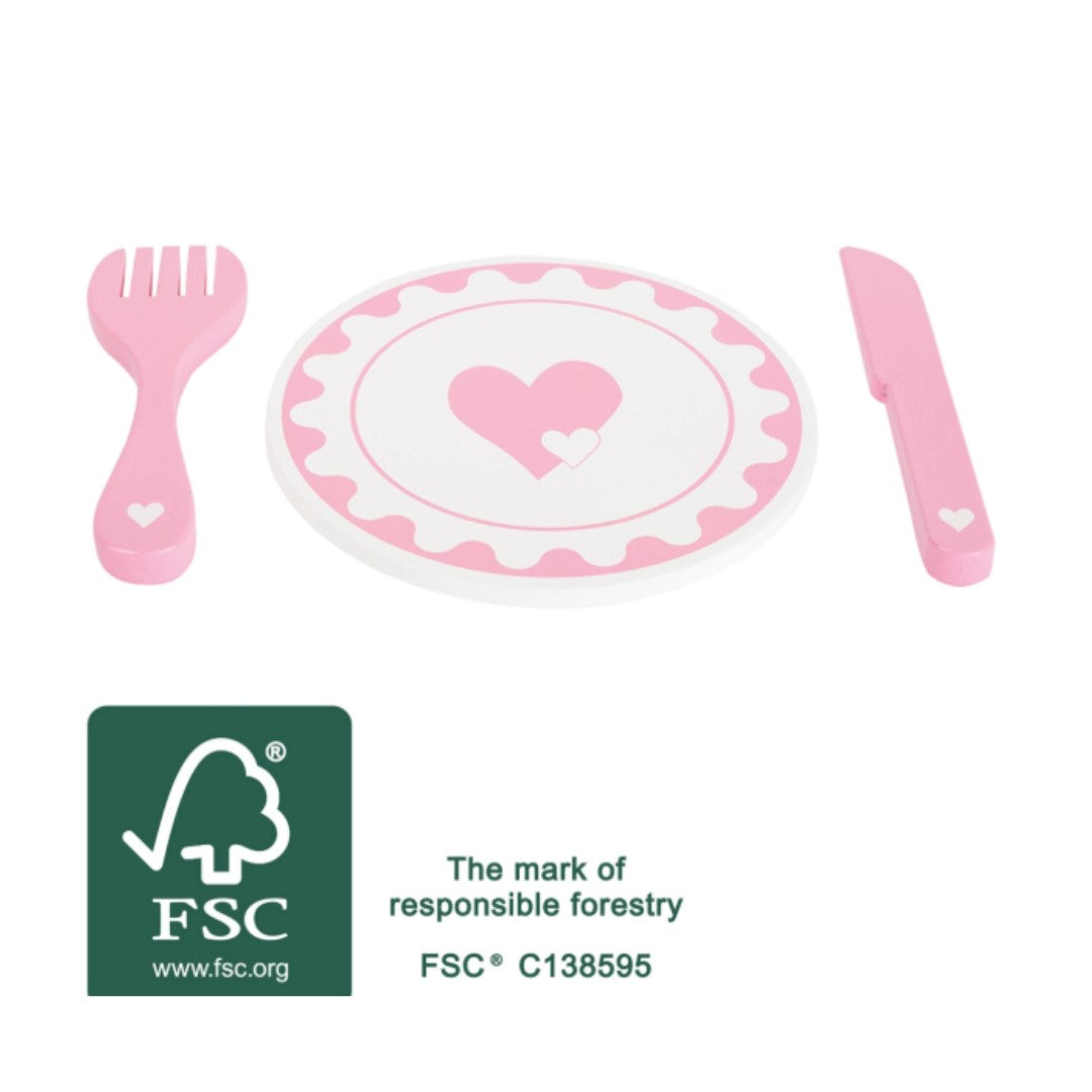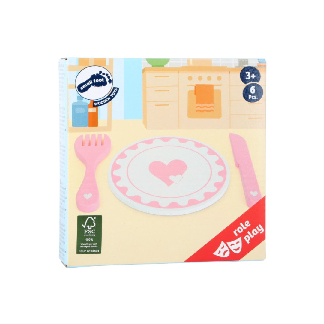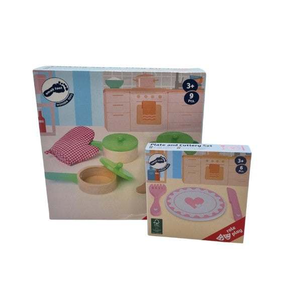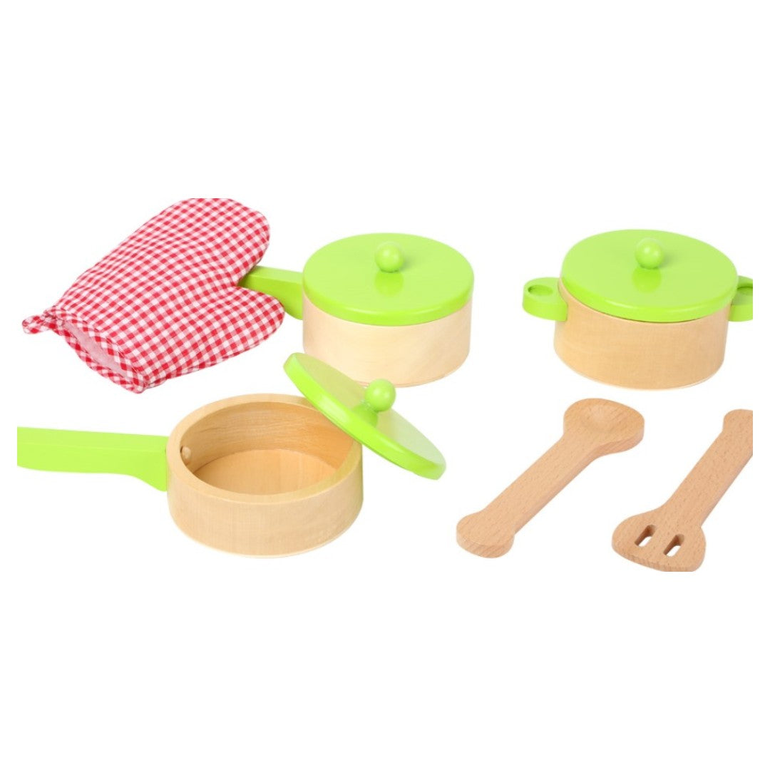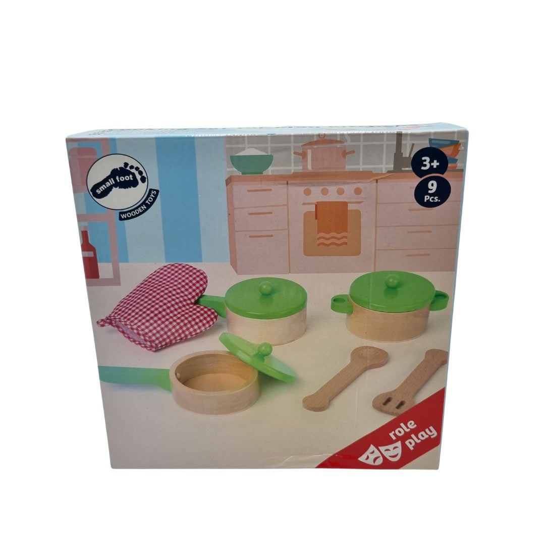 Set 9 pezzi pentoline in legno e set 6 pezzi piattini e posate in legno.