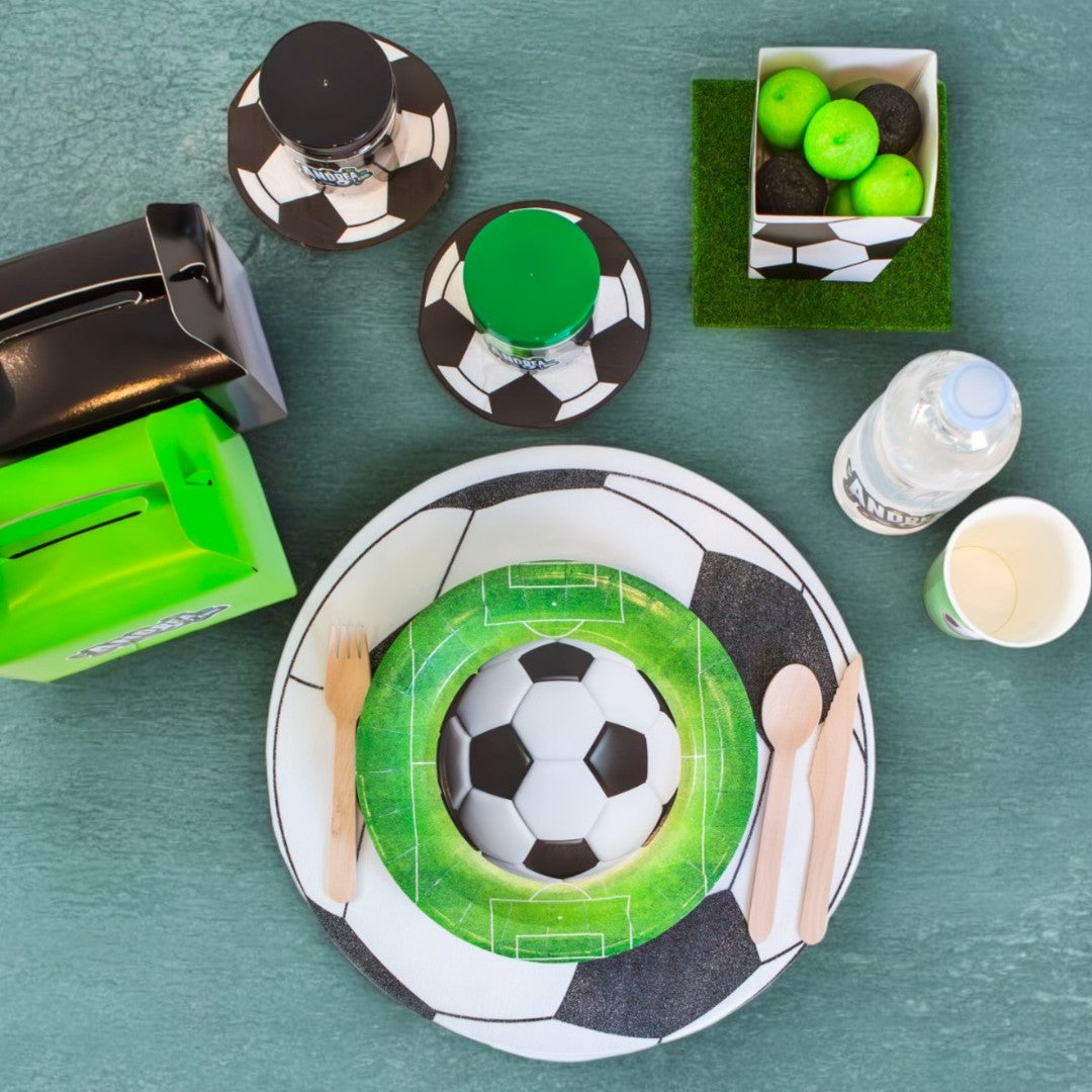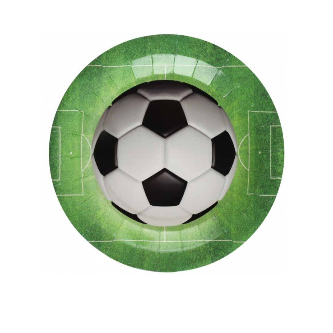 Confezione da 10 pezzi di piatto in carta diametro 23 cm, con disegno campo da calcio e pallone da calcio.