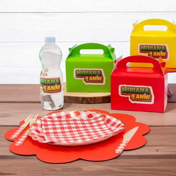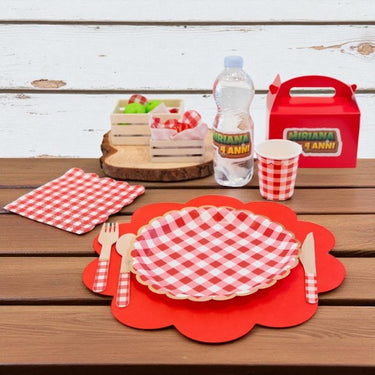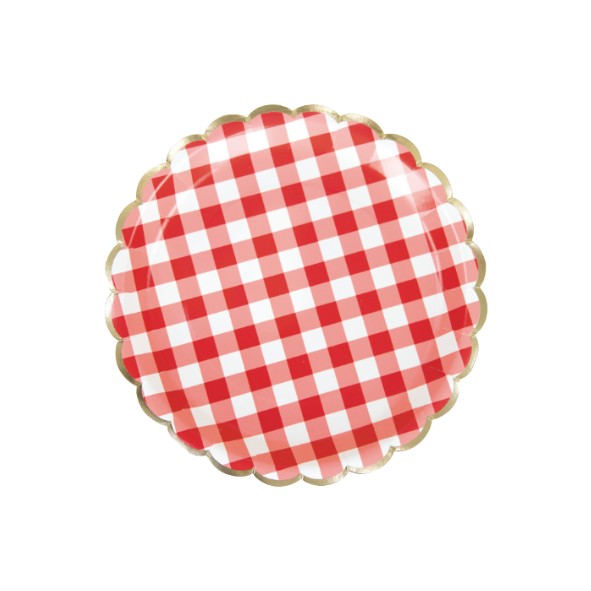 Confezione da n.8 piatti smerlati in carta, diametro 23 cm, a quadretti rossi con bordo oro.