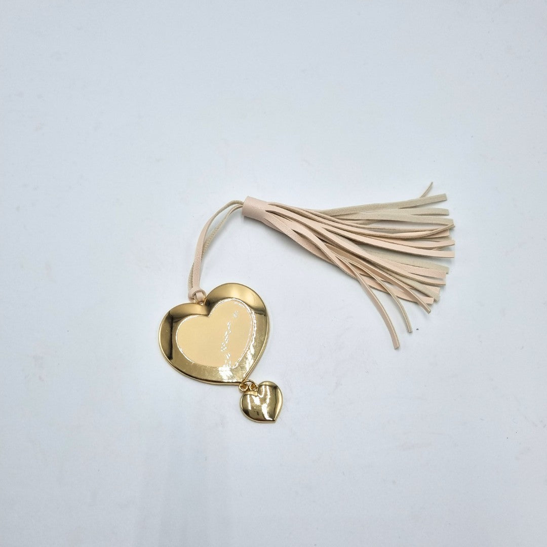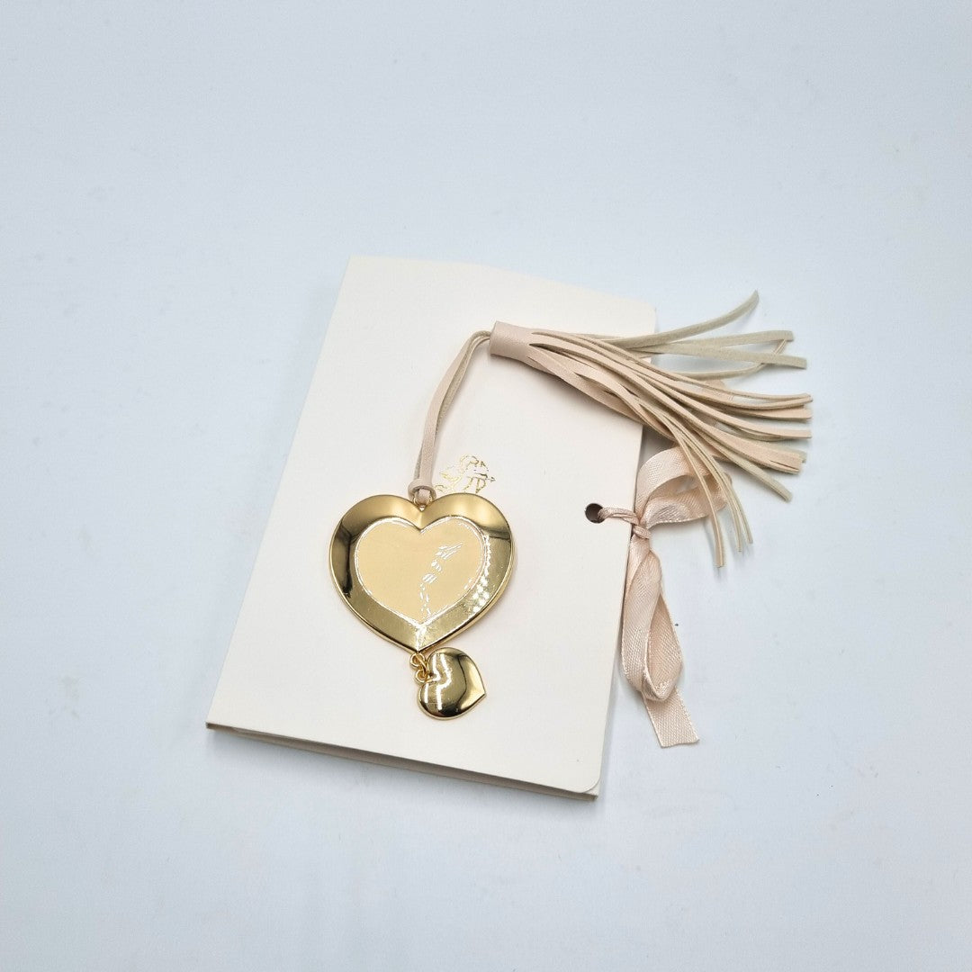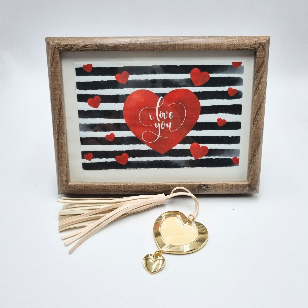 Portafoto in legno con stampa e segnalibro in metallo a forma di cuore con nappina in ecopelle.