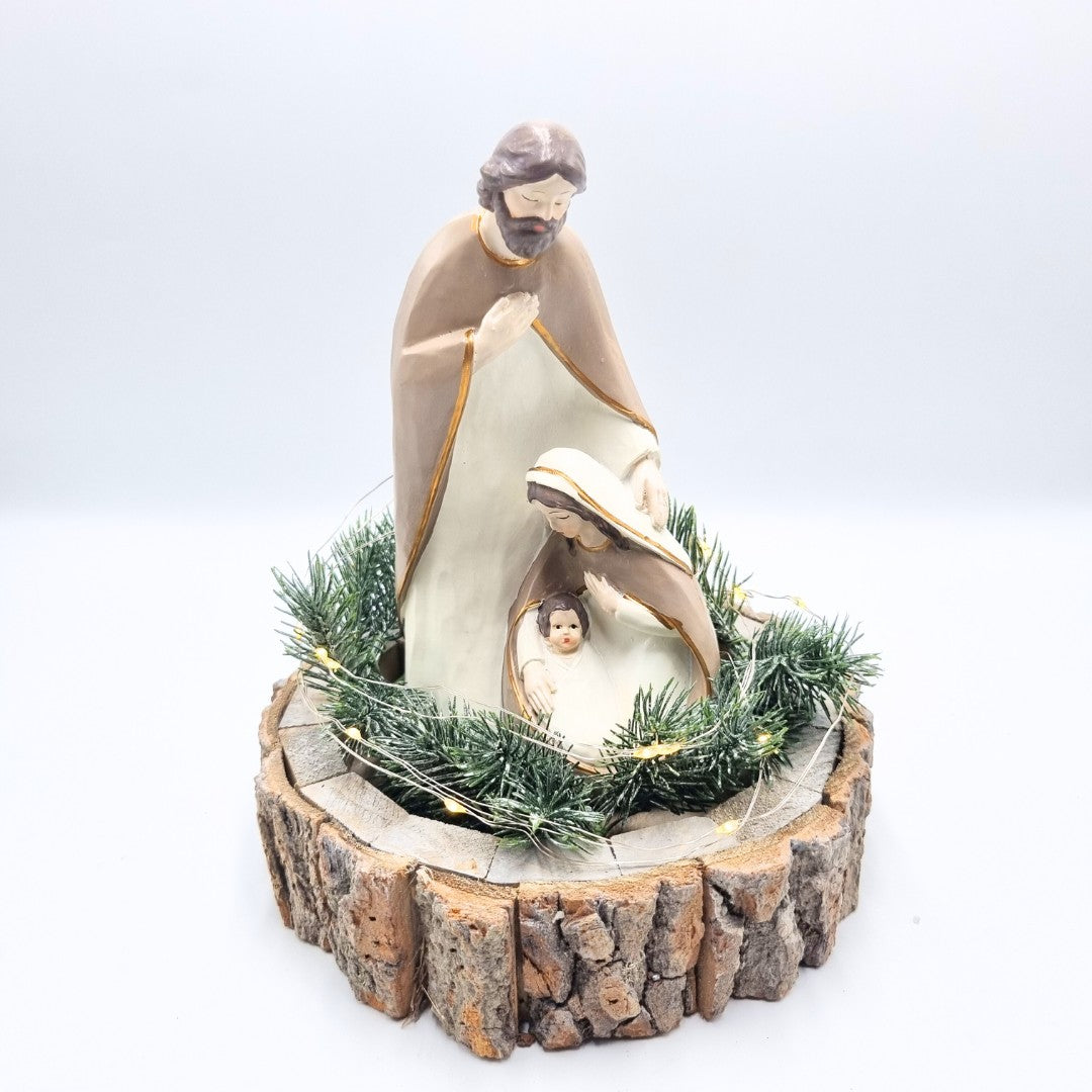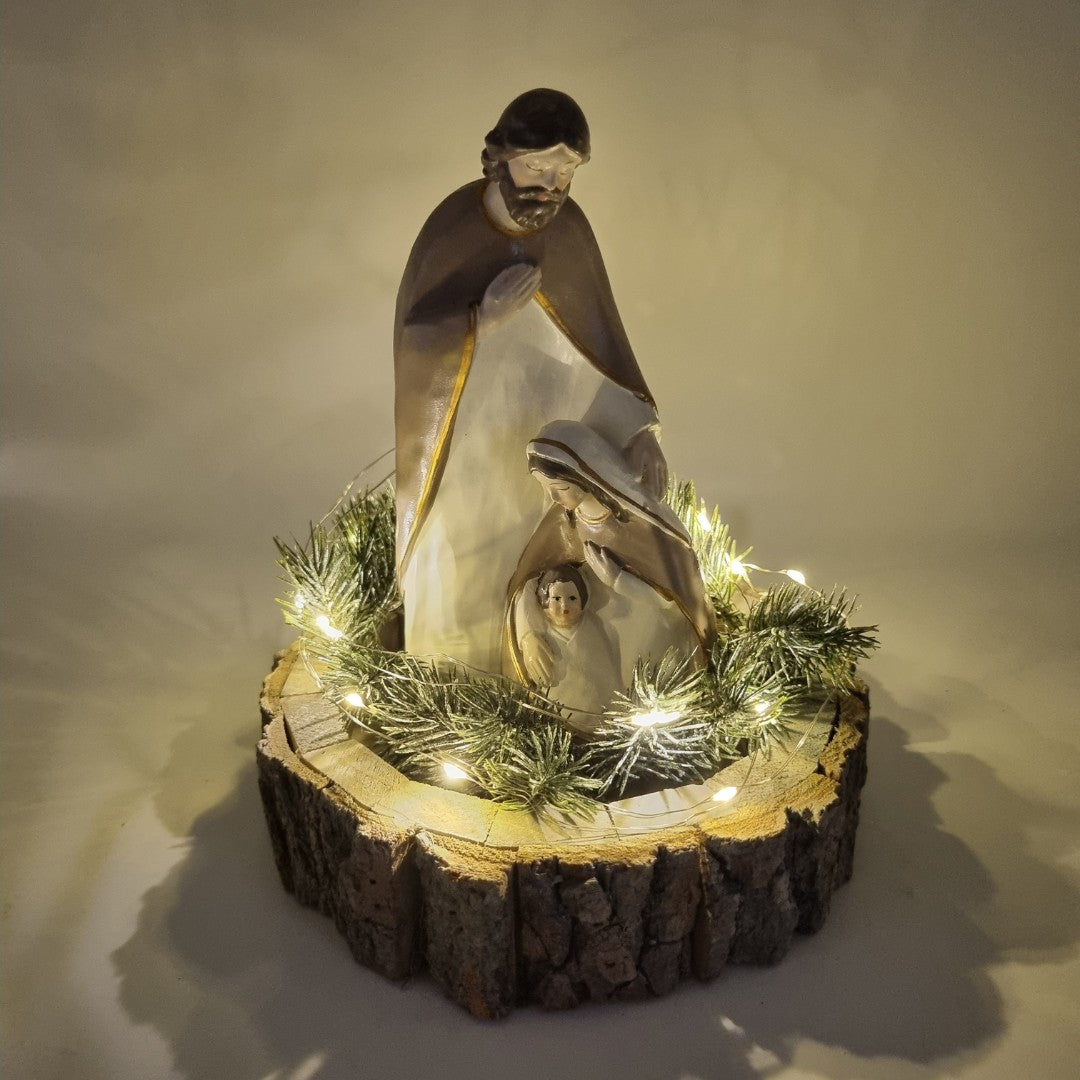Sacra Famiglia (h 18 cm) in resina, su base tronco (diametro 17,5 cm) con filo di luce led e rametti di abete.