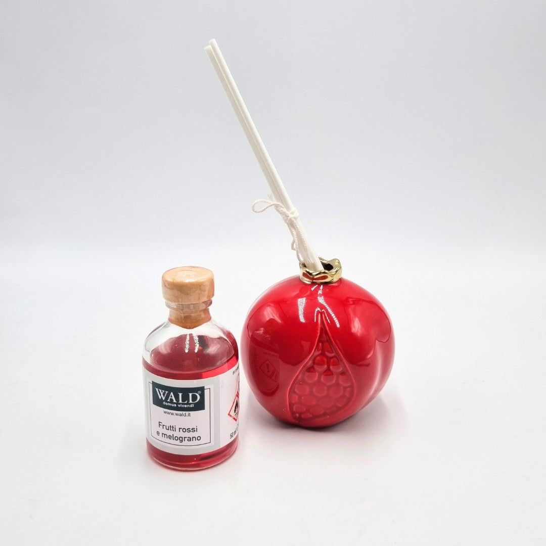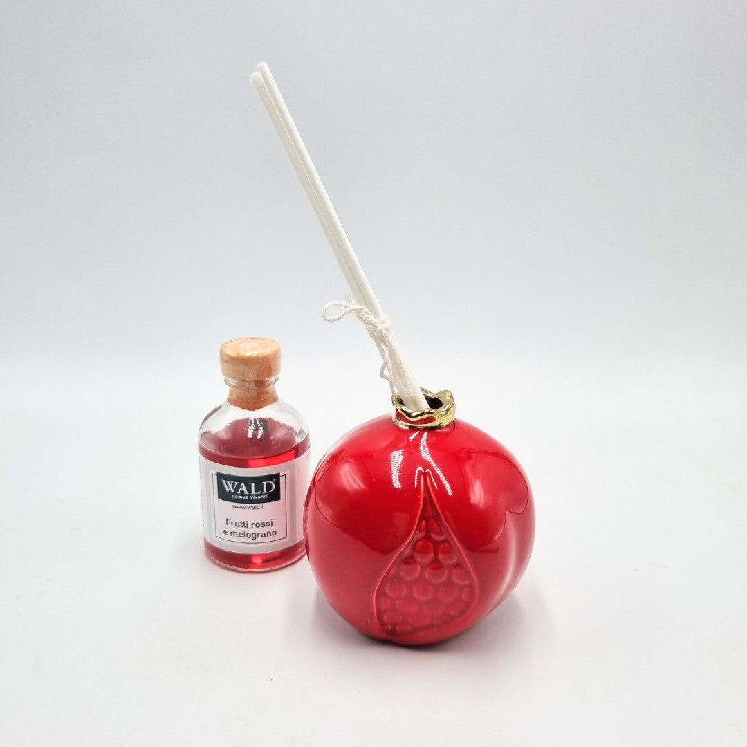 Melagrana profumatore in ceramica, colore rosso con bottiglietta di profumo "Frutti rossi e melagrana" da 50ml e bastoncini inclusi.