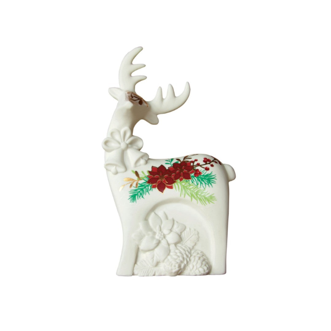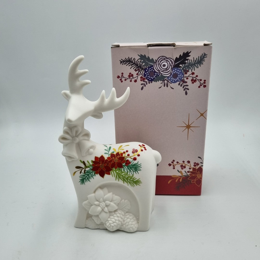 Renna natalizia, colore oro e rosso, porcellana biscuit con led (batterie incluse).