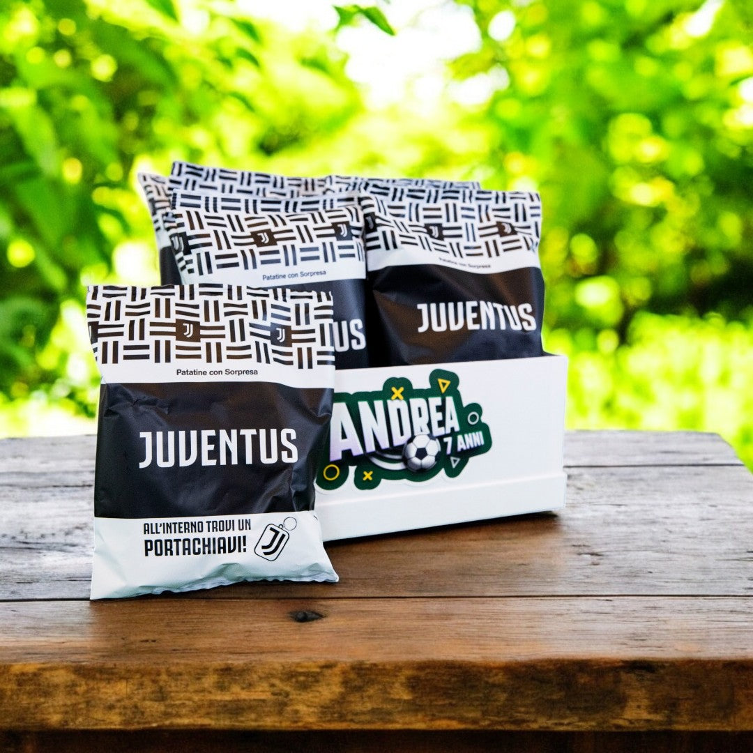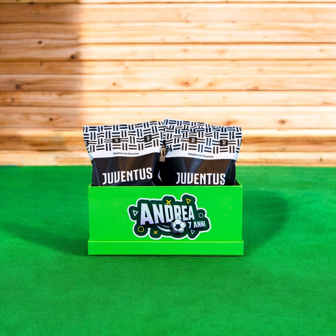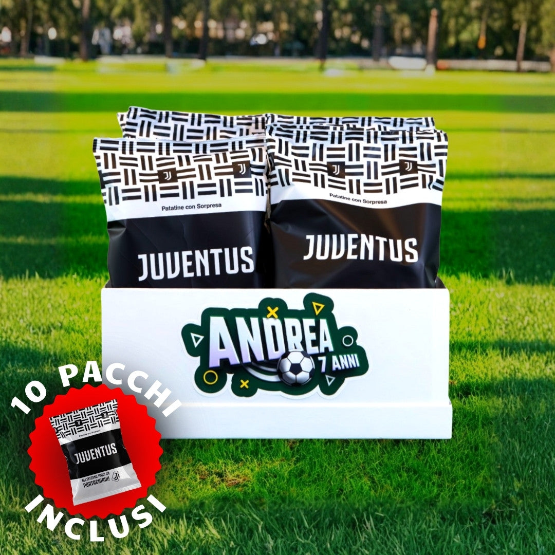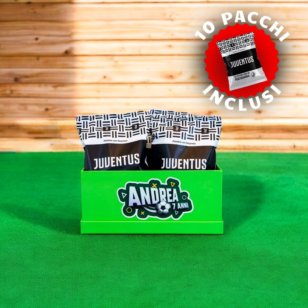 Scatola con adesivo personalizzato e n.10 pacchi di patatine con sorpresa "Juventus" da 25g (colore della scatola verde o bianca).