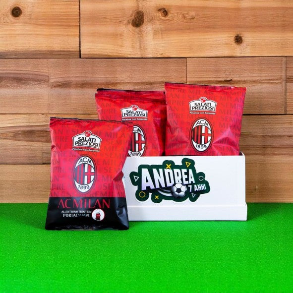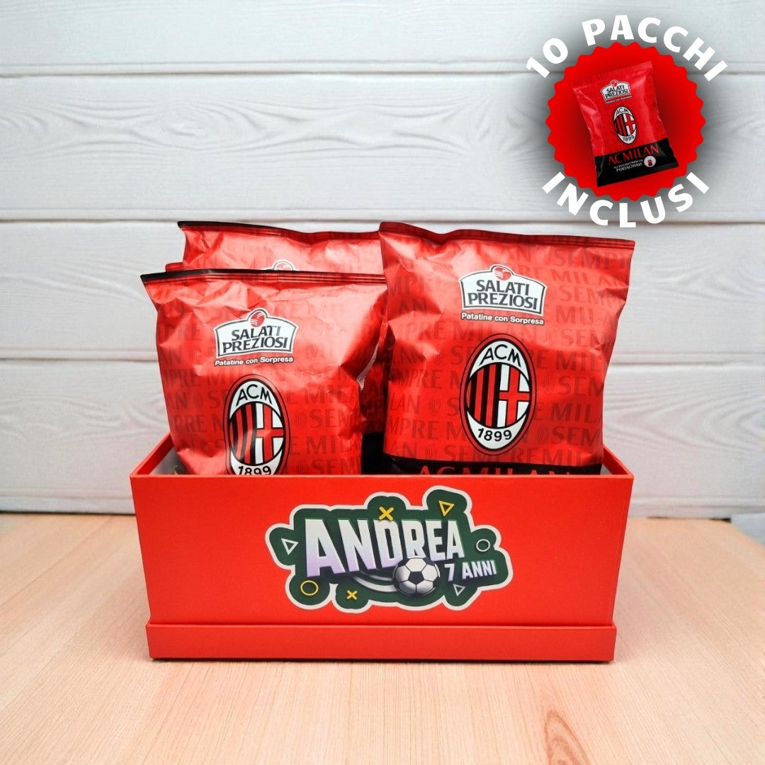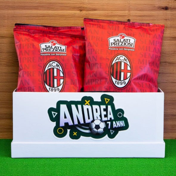 Scatola con adesivo personalizzato e n.10 pacchi di patatine con sorpresa "Milan" da 25g (colore della scatola bianca o rossa).