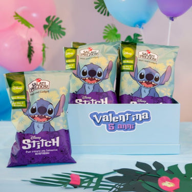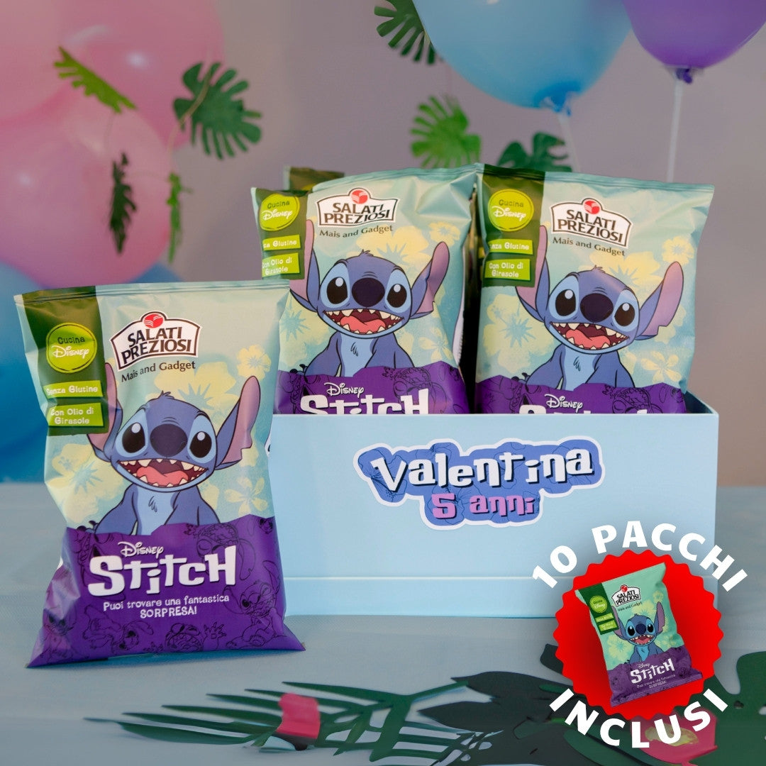 Scatola con adesivo personalizzato e n.10 pacchi di snack di farina di mais al gusto formaggio, con sorpresa "Stitch".