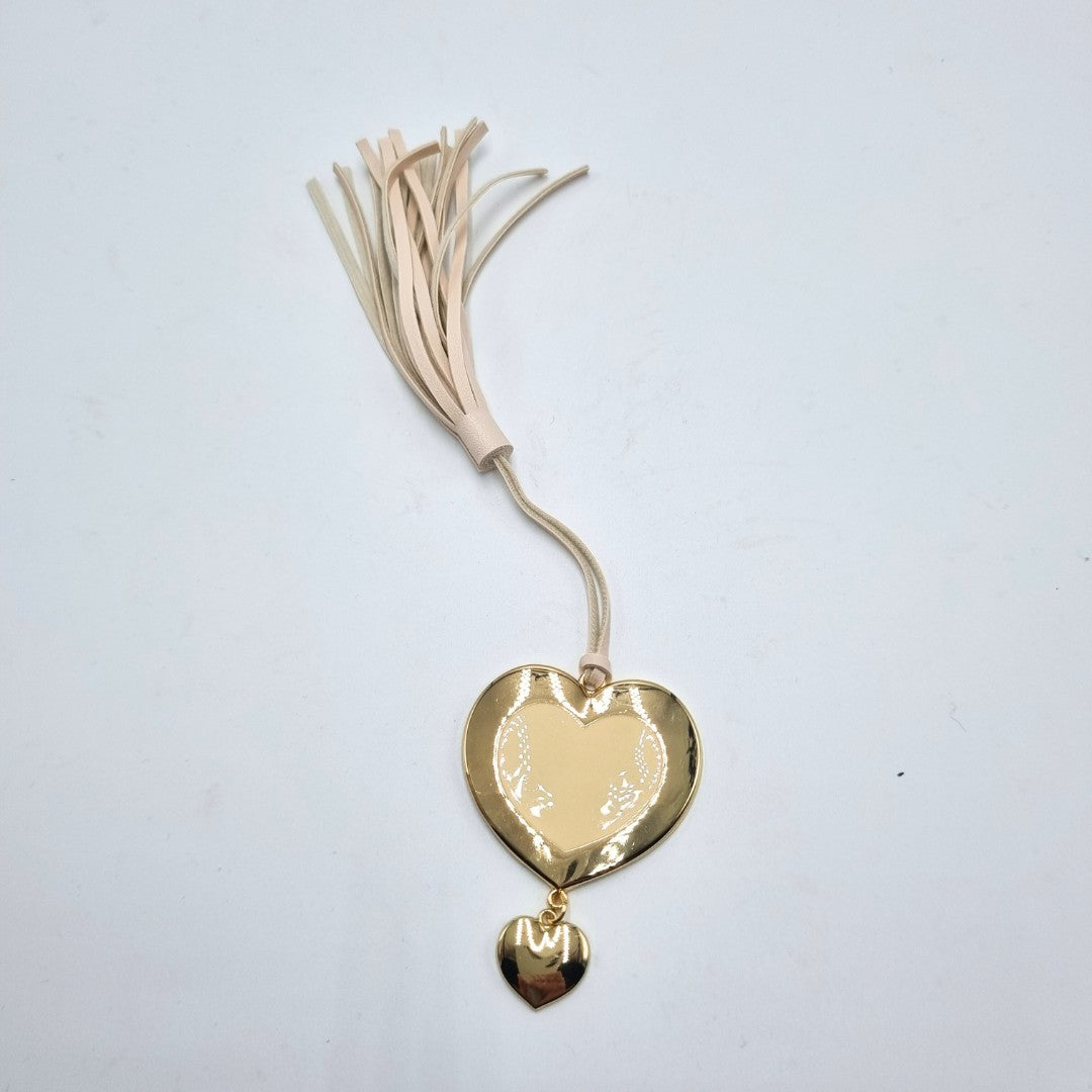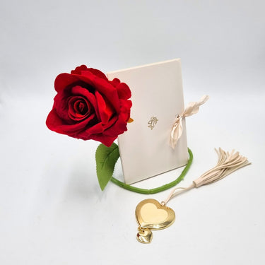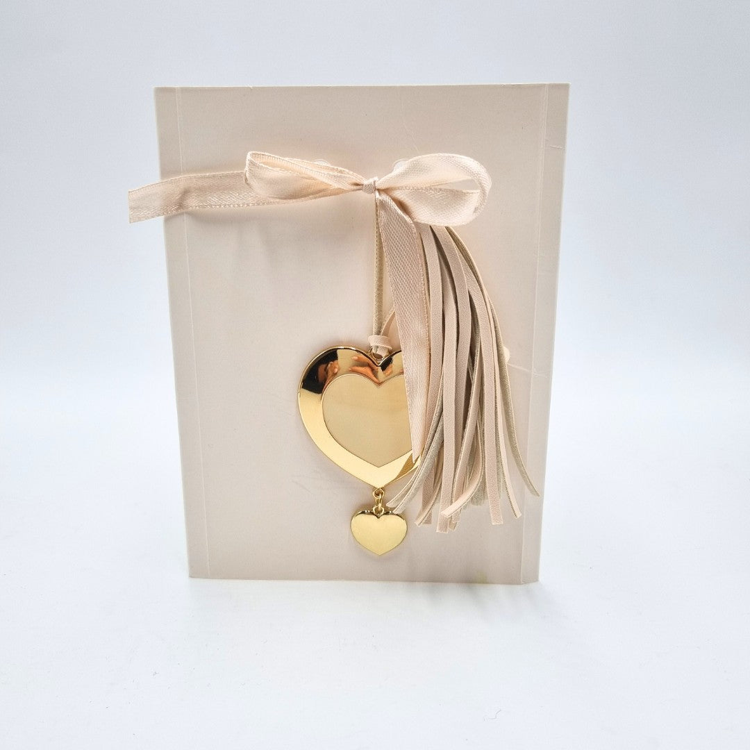 Segnalibro ciondolo in metallo a forma di cuore (5 cm) con nappina in ecopelle, abbinato ad una rosa finta in velluto rosso.