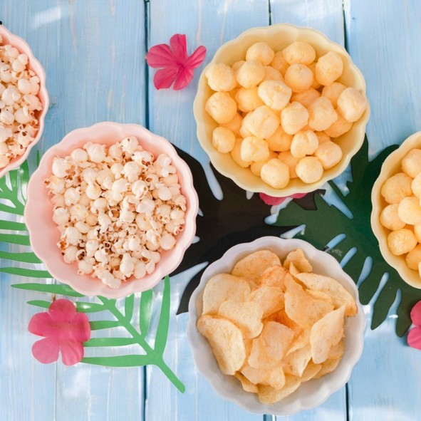 Set di n.6 ciotole in tre varianti di colore rosa, verde e celeste in canna da zucchero e bambù, senza plastica (smaltimento con la carta), ideali per patatine e popcorn o caramelle.