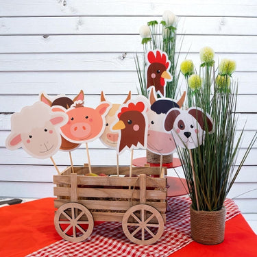 Set composta da n.8 sagome di animali della fattoria (gallo, gallina, maialino, pecora, mucca, capra, cane, cavallo), in cartoncino, con stecco in legno.