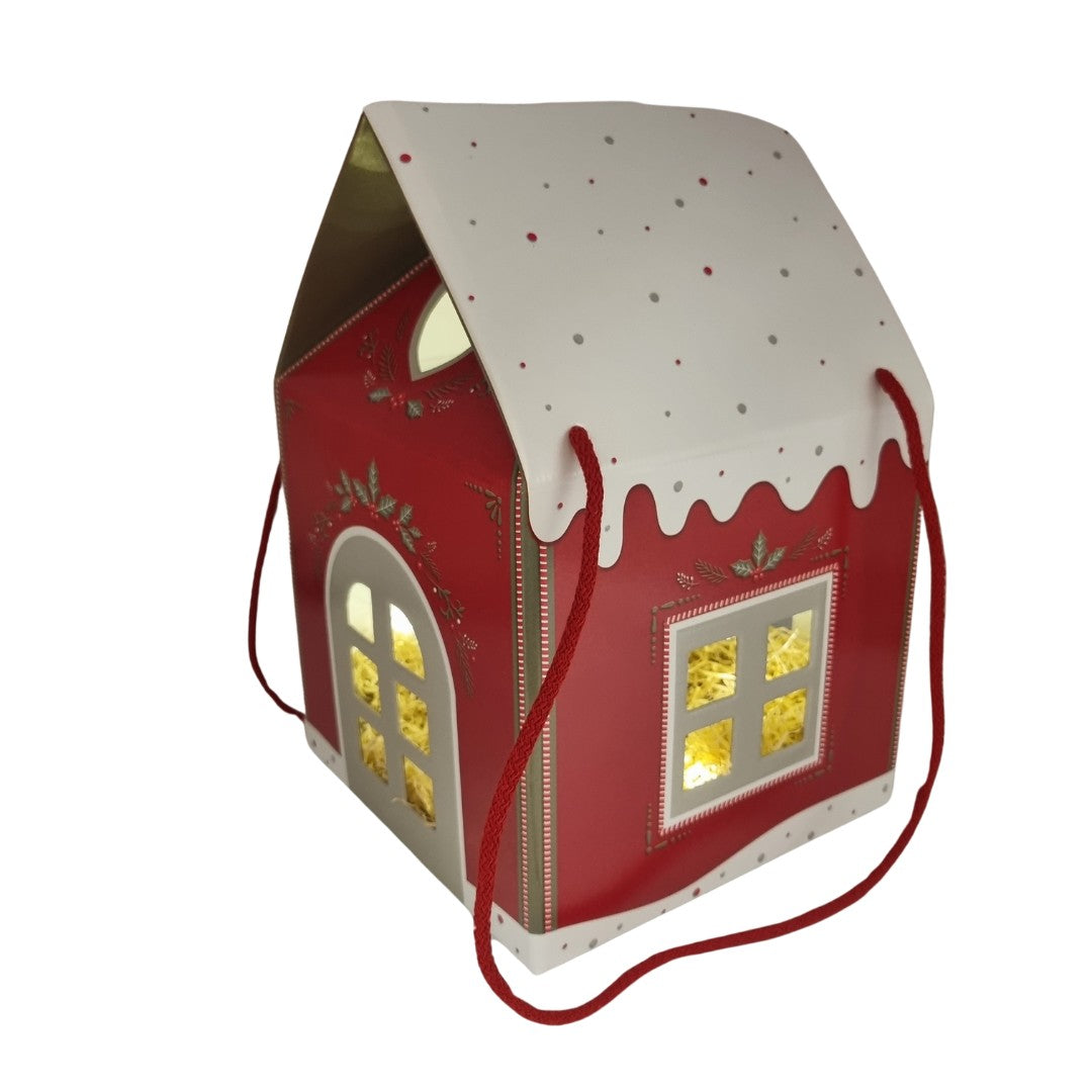 - casetta di natale in cartoncino con filo di luci led a batterie (incluse) (30 x 20 x 20 cm).