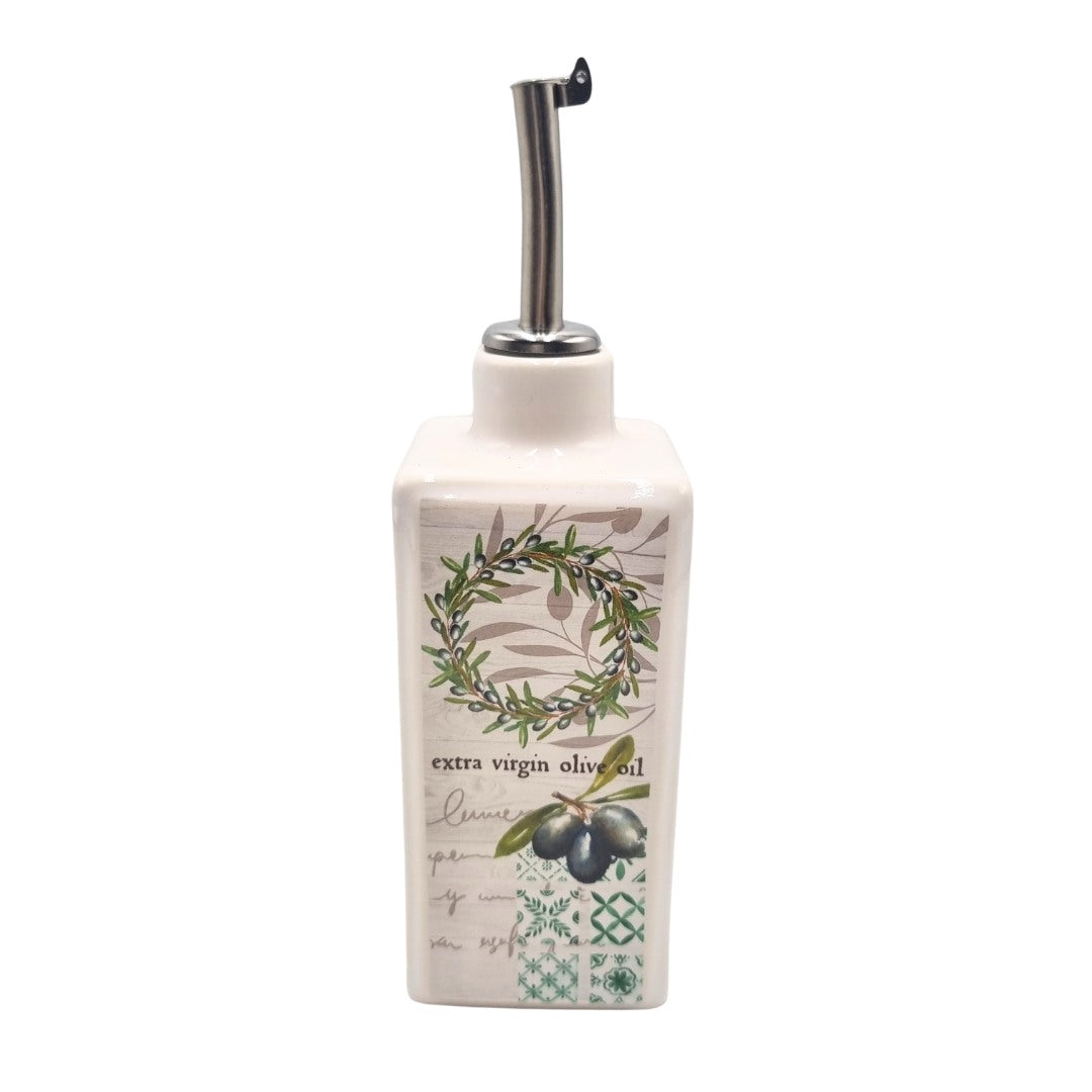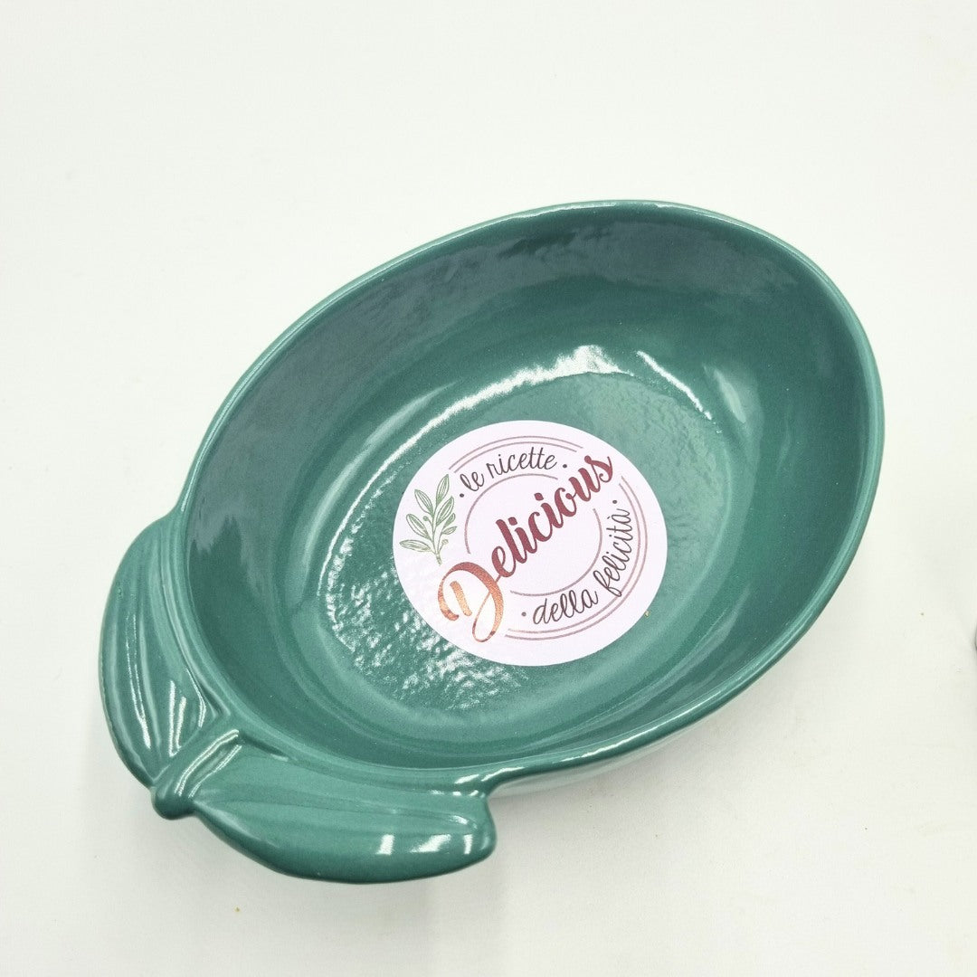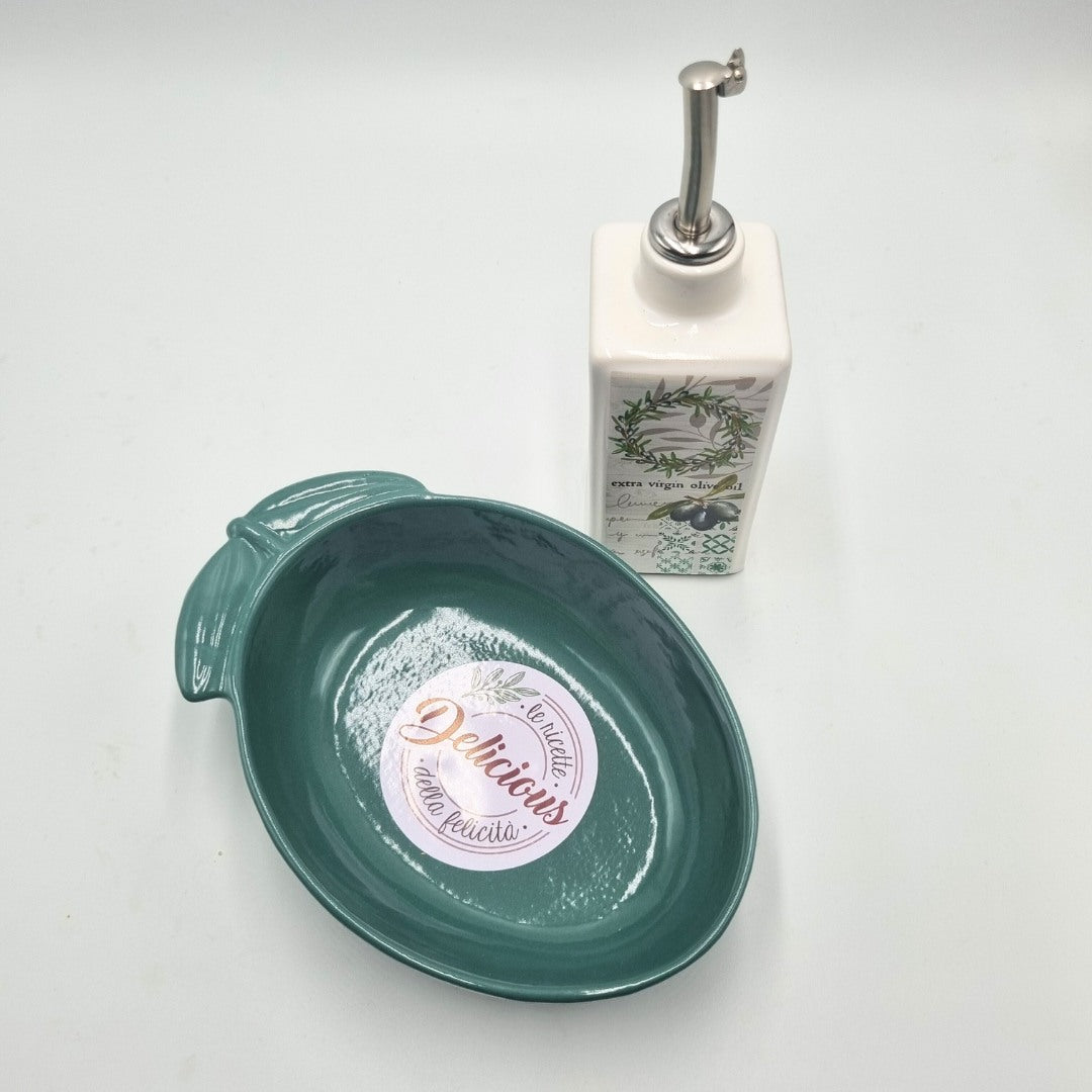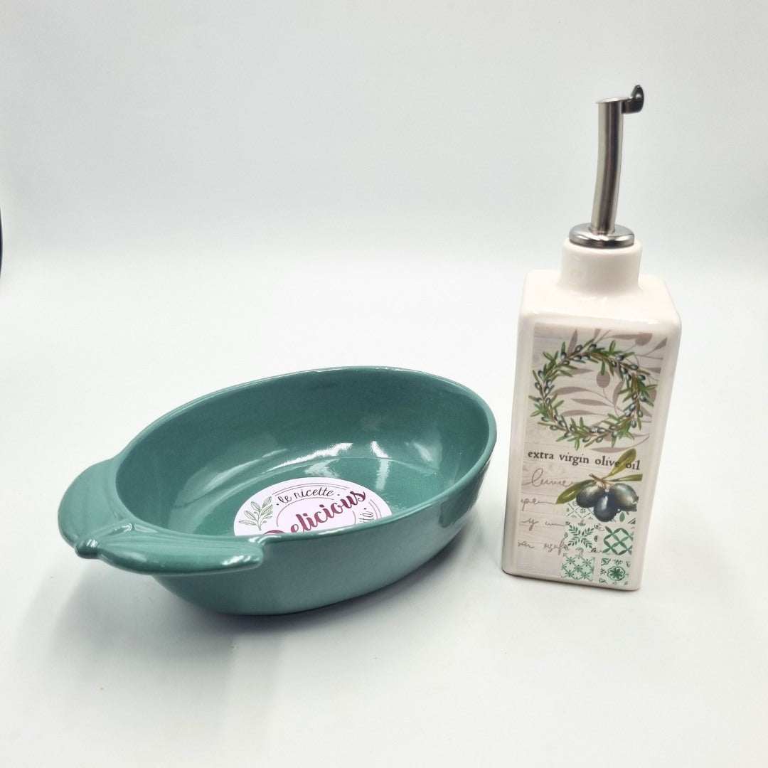 Set cucina composto da oliera in ceramica con beccuccio dosatore e pirofila a forma di oliva.