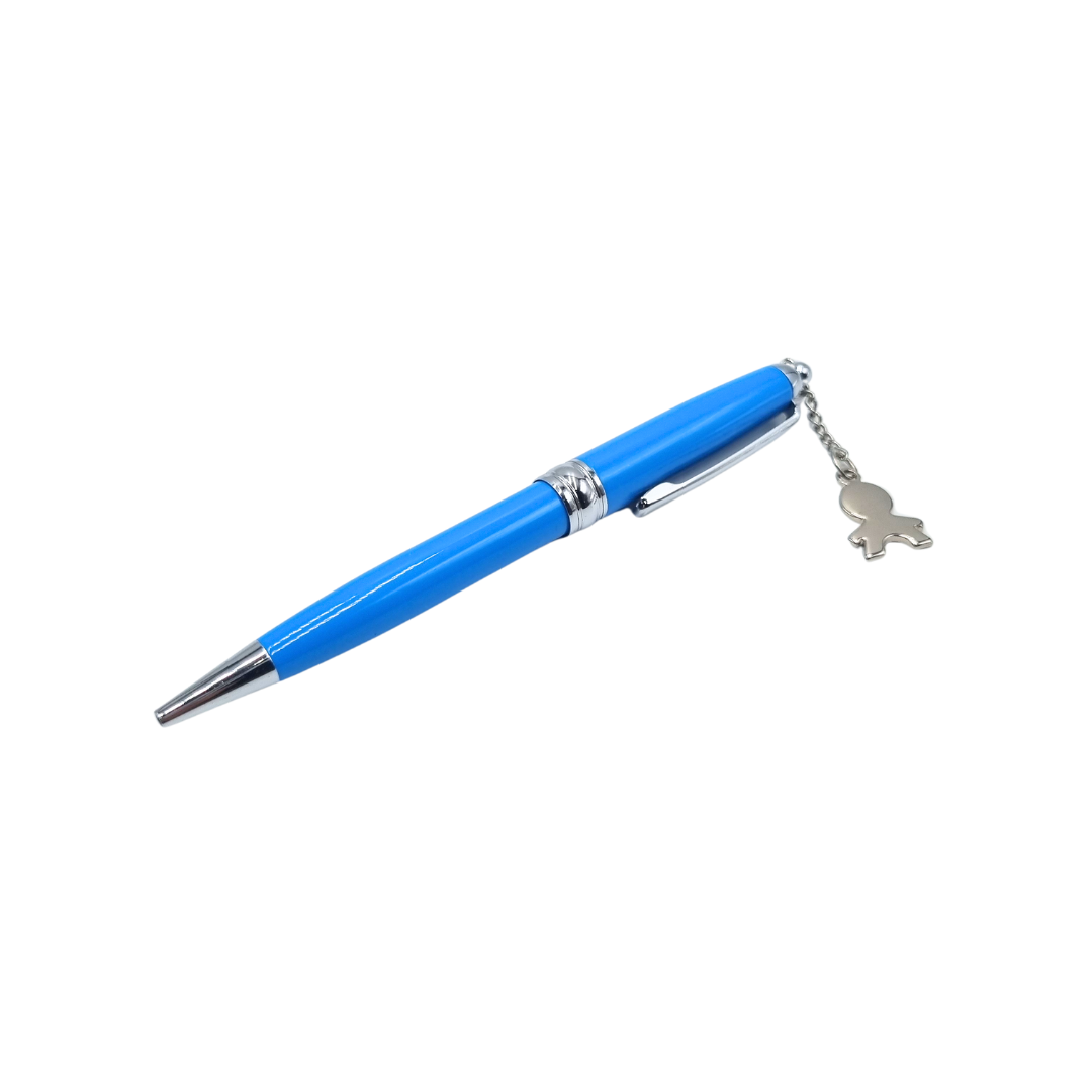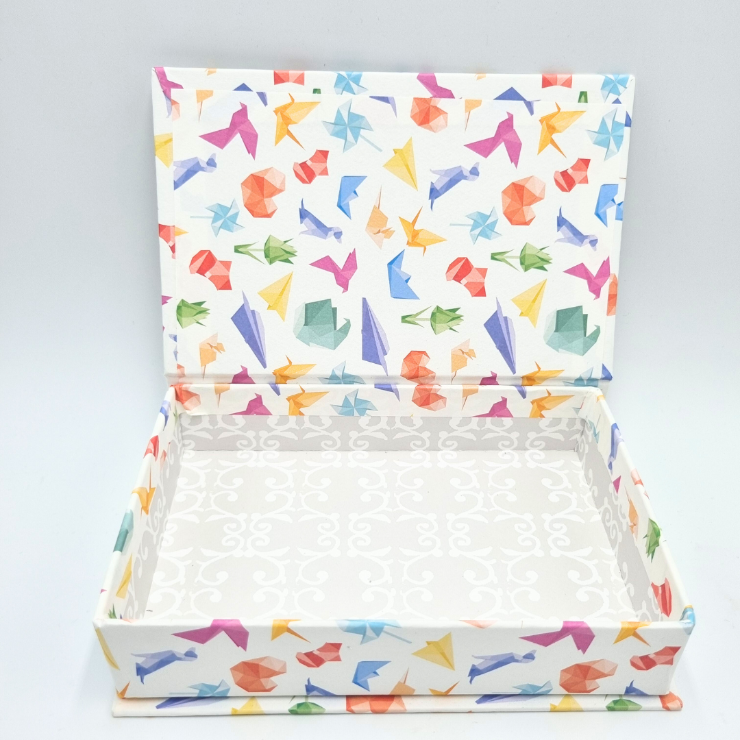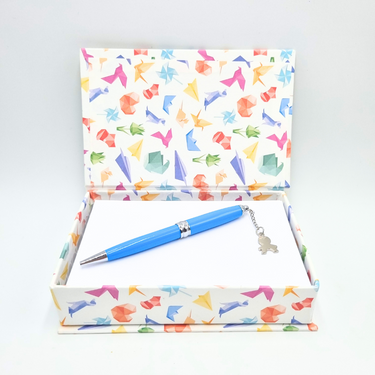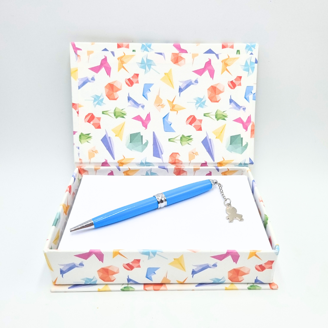 Set da scrivania composto da una scatola in cartoncino porta bigliettini, made in Italy, con fantasia origami e penna a sfera con ciondolo bimbo.