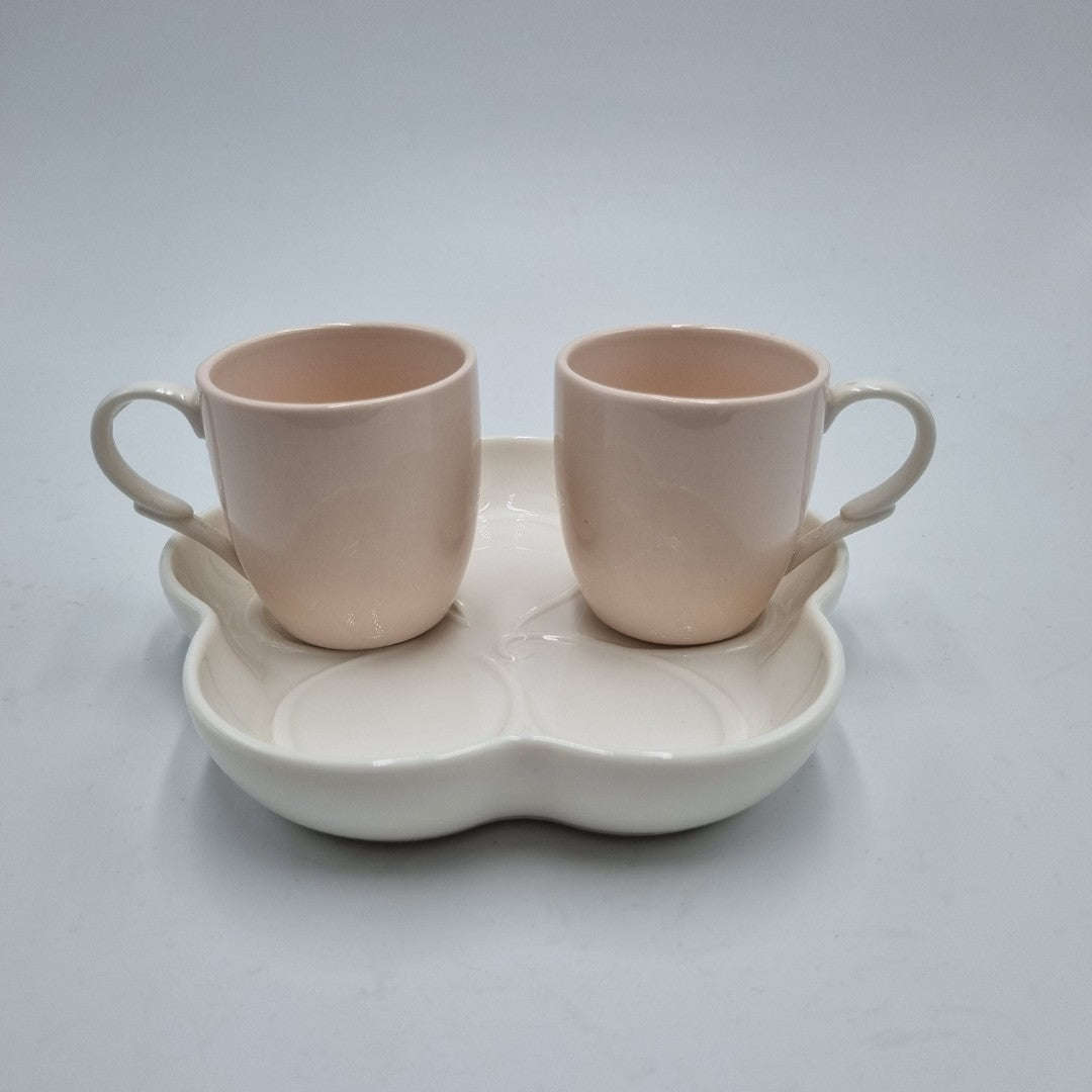 Set tazzine da caffè con vassoio e zuccheriera in porcellana rosa e tortora