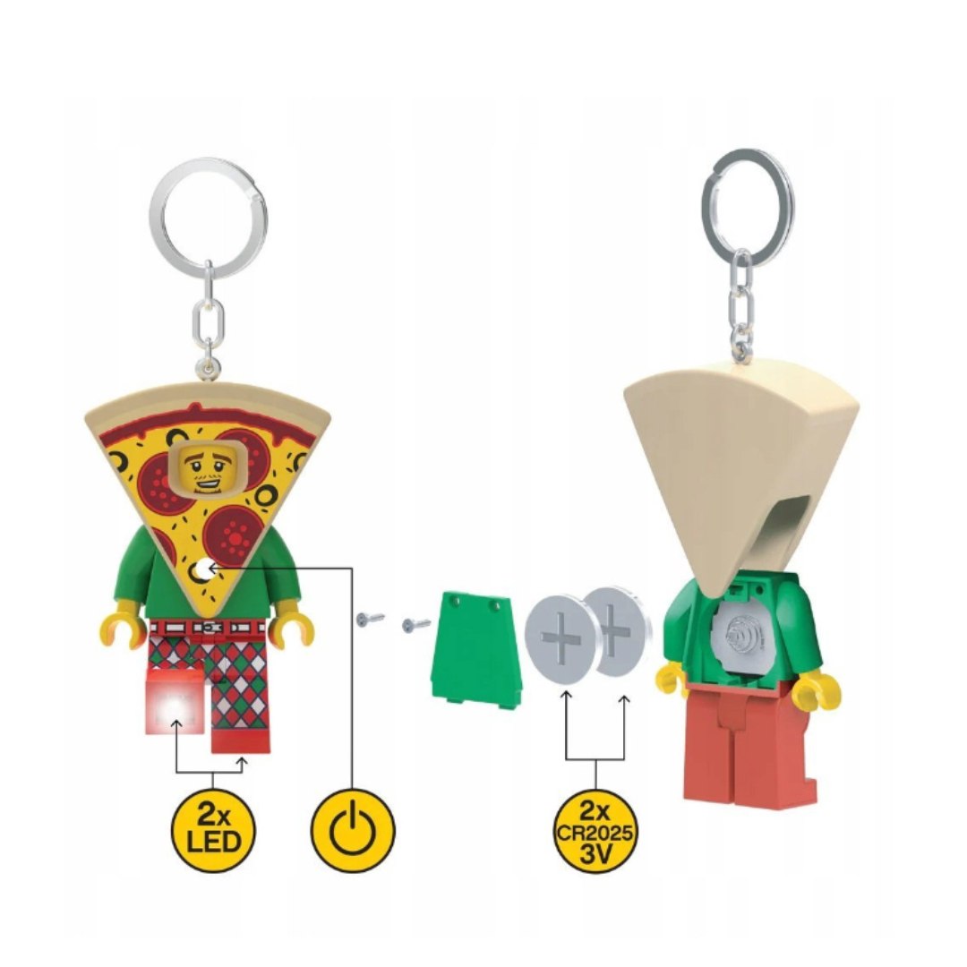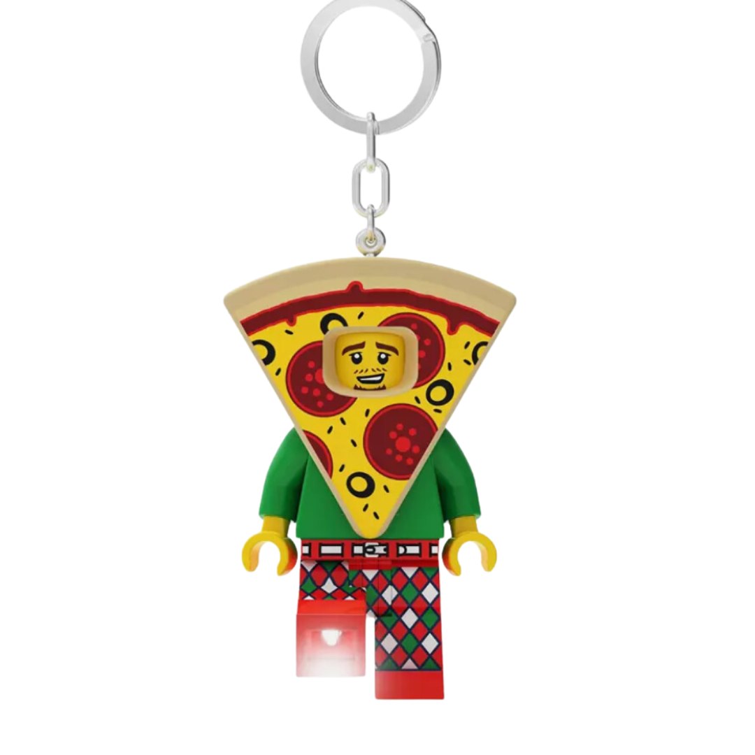 Portachiavi con grande mini figure dell’Uomo Pizza dotata di braccia snodabili, luminosa luce a LED su ciascun piede, gambe snodabili per puntare i fasci di luce in direzioni diverse e un pulsante sul corpo per accendere le luci..