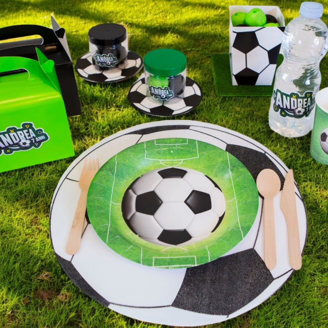 Set di 6 tovagliette in TNT a forma di pallone da calcio diametro 34 cm.