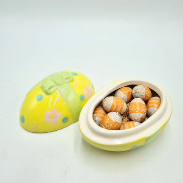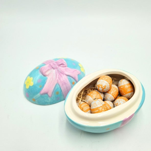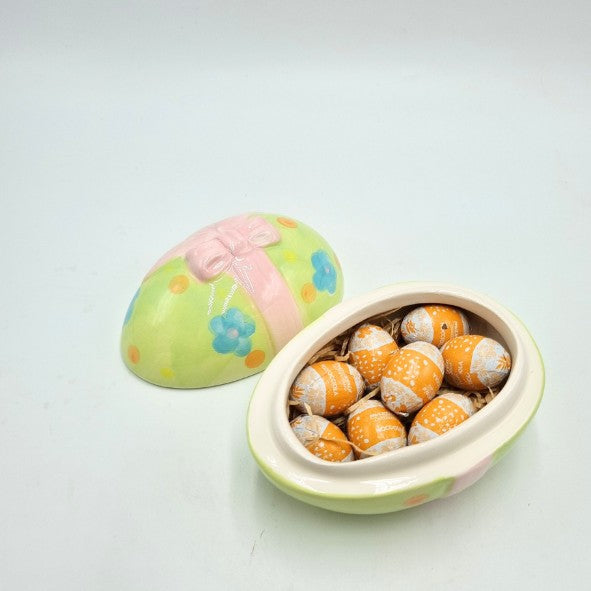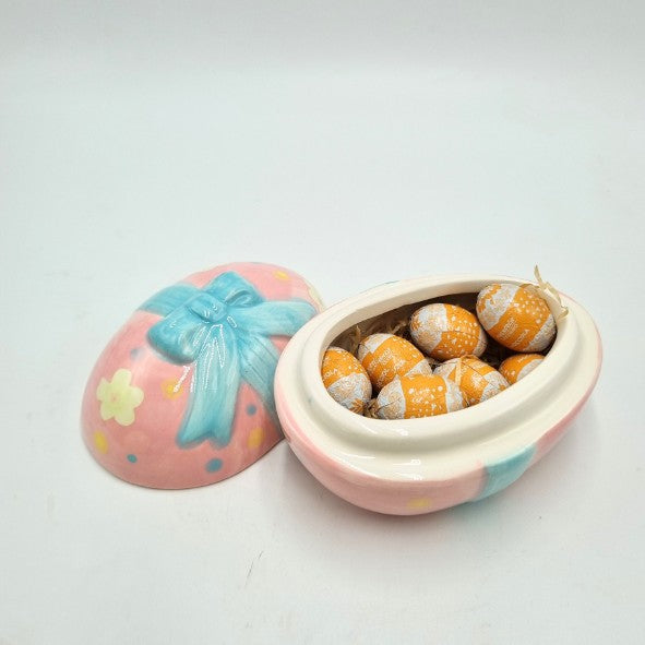 Uovo un ceramica con coperchio (11 x 8 cm) con n.8 ovetti di cioccolato alla nocciola Maxtris, disponibile in 4 varianti di colore.